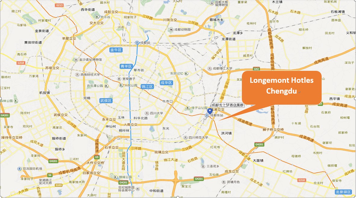 Chengdu West Station is the starting station of the Sichuan-Tibet Railway and is also one of the "three auxiliary stations" in the "three main, three auxiliary" station layout of Chengdu's railway hub plan. It's about 30 kilometers away from Chengdu Longemont Hotel, which takes about 45-60 minutes by taxi (about 70 RMB).