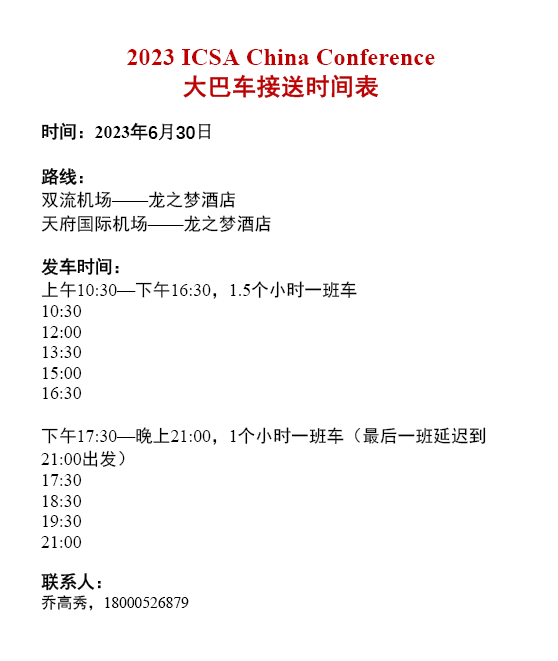 各位参会老师!为了方便各位老师在30号当天顺利到达酒店报道,会务组在6月30号安排了大巴车接送,天府国际机场和双流机场的大巴车接送时间表见下面的文件,届时将由我们的志愿者接到各位老师并引导至大巴车上。天府国际机场到龙之梦酒店的时间大约为45分钟,双流机场到龙之梦酒店的时间大约为30分钟。乘坐高铁抵达的参会嘉宾,统一从东广场出口出站,我们也安排了志愿者接站。(大巴车接送时间表及路线图请下载附件)