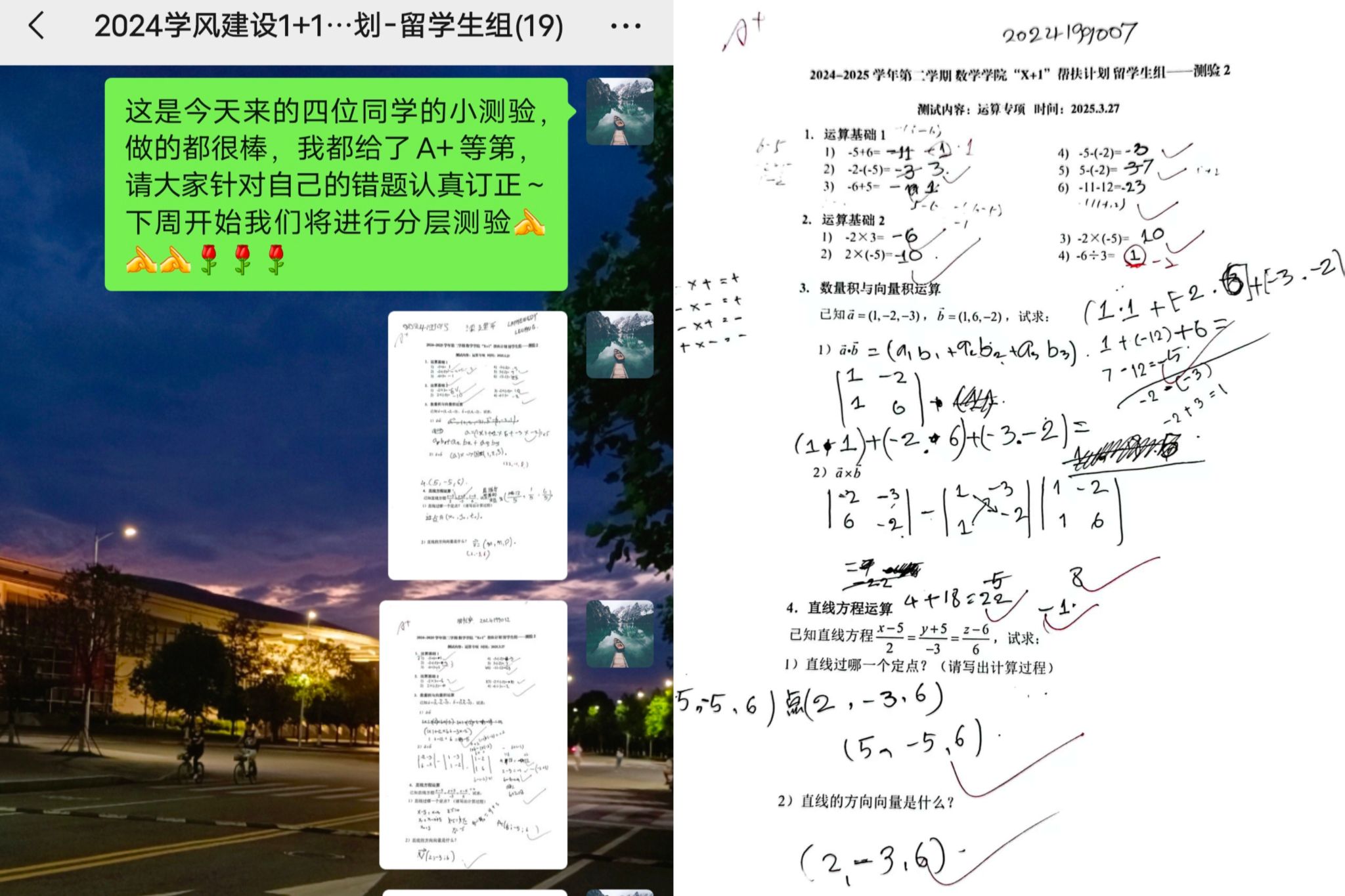 “数学+”学科赋能本科生综合素养提升项目的核心板块,该计划自启动以来便以“精准帮扶、朋辈引领”为导向,通过“专业课程辅导+学习习惯培养+跨文化交流”三维模式,构建起“一对一”“多对一”相结合的立体化帮扶体系。值得关注的是,该计划日前获评团省委学校“我为同学做实事”百佳项目及“最受同学欢迎项目”,其“党建引领+学业帮扶”的创新模式已成为高校学风建设的特色样本。
