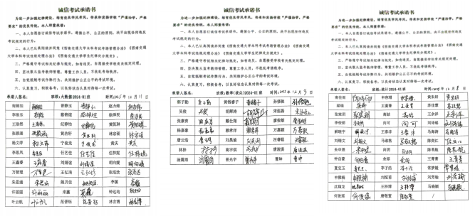 本科生考试违规处理办法》等核心文件,深入各班级开展领学宣讲,结合典型案例解读纪律要求。活动中,全体本科生签订《诚信考试承诺书》,以庄严承诺践行“严谨治学、诚信应考”的理念,营造出“人人守诚信、科科重规范”的良好氛围,传承了学校优良治学传统。