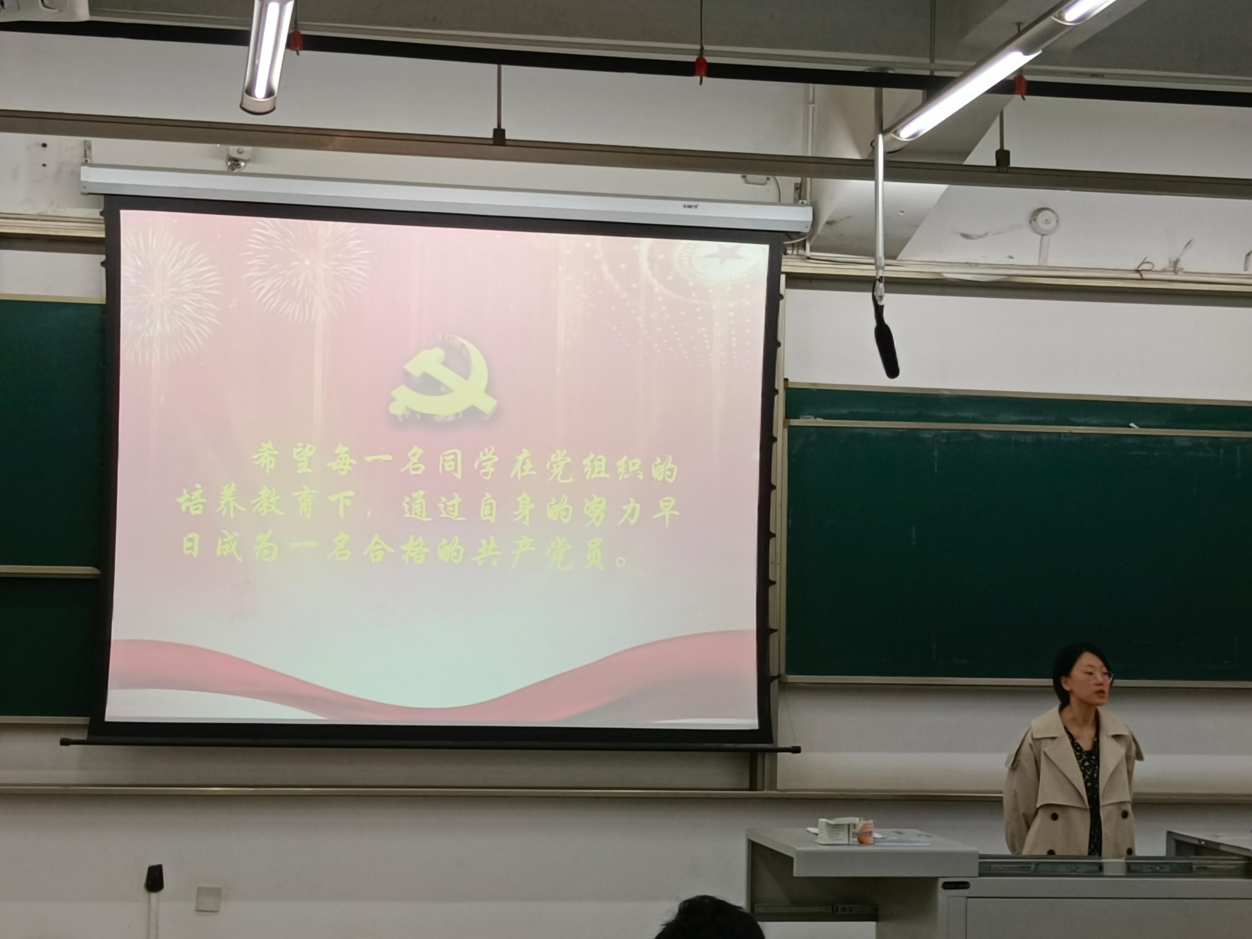 首先,张老师带领我们认真学习《中国共产党章程》第一章第一条的内容,帮助我们正确理解申请入党的条件、充分领会党员的基本条件、明确党员的权利和义务。她强调共产党员是工人阶级的有共产主义觉悟的先锋战士,同时也是劳动人民的普通一员。接下来,张老师向我们介绍了党员发展的基本流程:申请入党,积极分子、发展对象考察培养,接收预备党员的手续与程序。之后,张老师指出党的事业的发展需要优秀青年,积极争取入党是大学生的正确选择。最后,张老师希望在座每一位同学要树立正确的入党动机,在党组织的培养教育下,按照《中国共产党章程》规定,严格要求自己,通过自身的努力早日成为一名合格的共产党员。