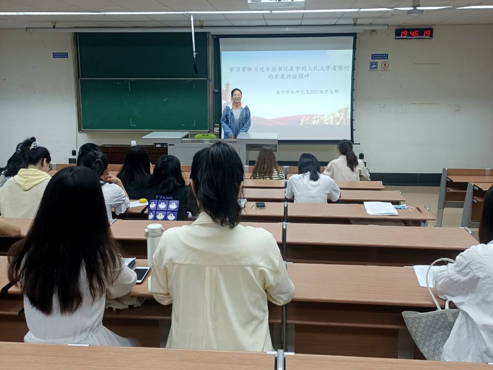 首先,支部组织委员李冉领学习近平总书记在中国人民大学考察时的重要讲话精神。支部全体成员在李冉同志的带领下结合PPT和视频内容,对习近平总书记重要讲话的主要内容进行深入学习。李冉同志结合自身专业,就自己的学习感悟与同学们做了分享交流,她讲道:“作为一名数学专业的研究生,我们要打牢学科功底,专注基础研究,敢于把“冷板凳”坐热,真正把论文写在中国大地上,把学问做到人民心坎里。”
