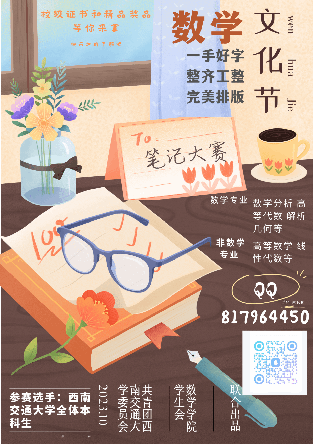 为进一步加强学风建设,发挥优秀数学笔记的模范带头作用,加强同学之间的学习交流,树立良好的学习之风,宣传优秀学习榜样,夯实学科基础,形成学数学、懂数学、爱数学的良好氛围。传承“严谨治学,严谨要求”的交大传统,增强同学们数理强国的信念,特举办茄子视频