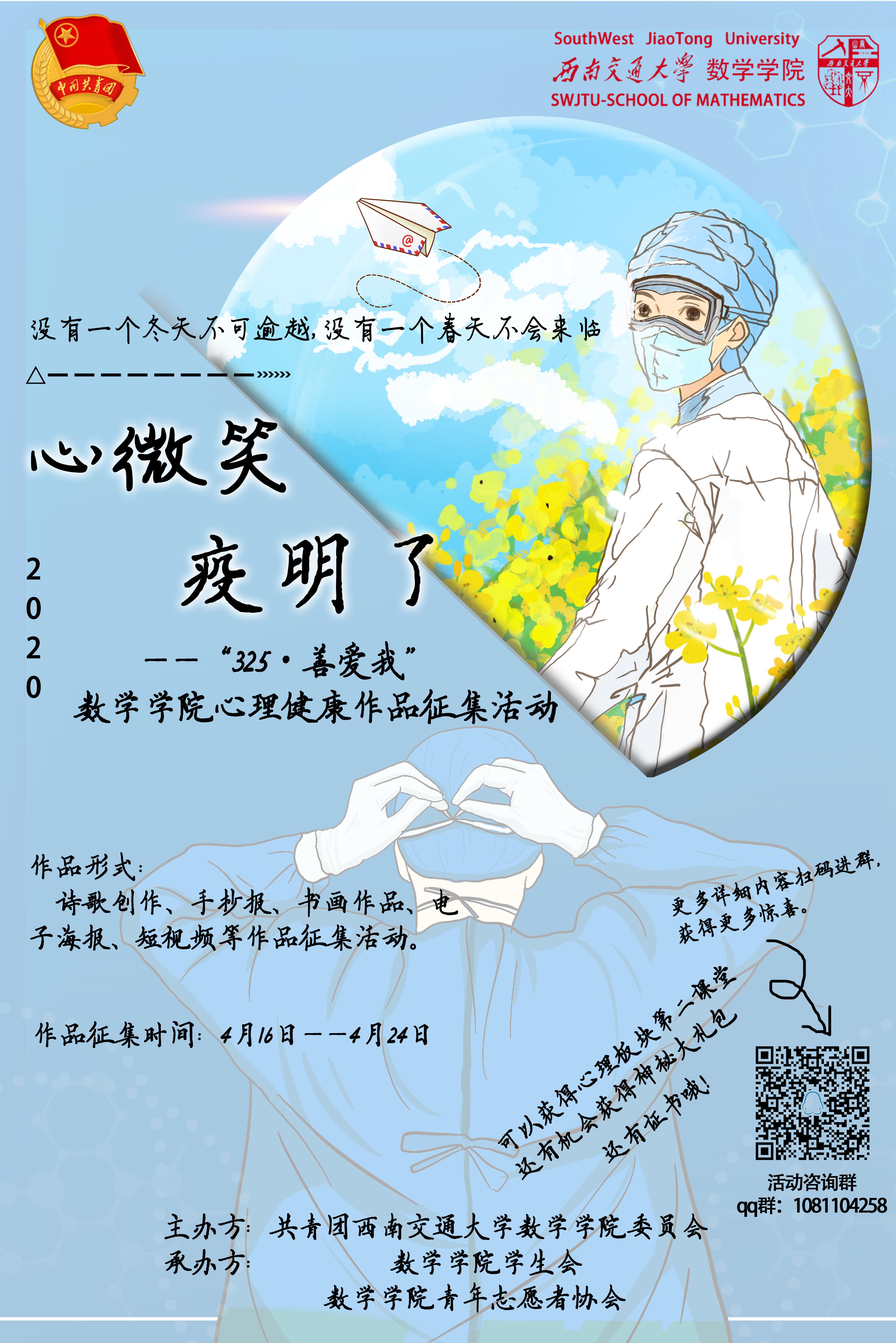 在这个特别的春天,由于新冠疫情的影响,我们无法在交大校园如约相见,只能通过网络进行学习和联络。即便如此,我们依然要保持积极乐观的心态,要相信没有一个冬天不可逾越,没有一个春天不会来临。为了响应学校在疫情期间开展心理健康活动的工作要求,帮助大学生正视心理问题,加强疫情心理、生命和感恩教育,引导大学生善待自我、关爱自我,珍视健康、敬畏生命,营造积极向上的校园心理文化。由茄子视频