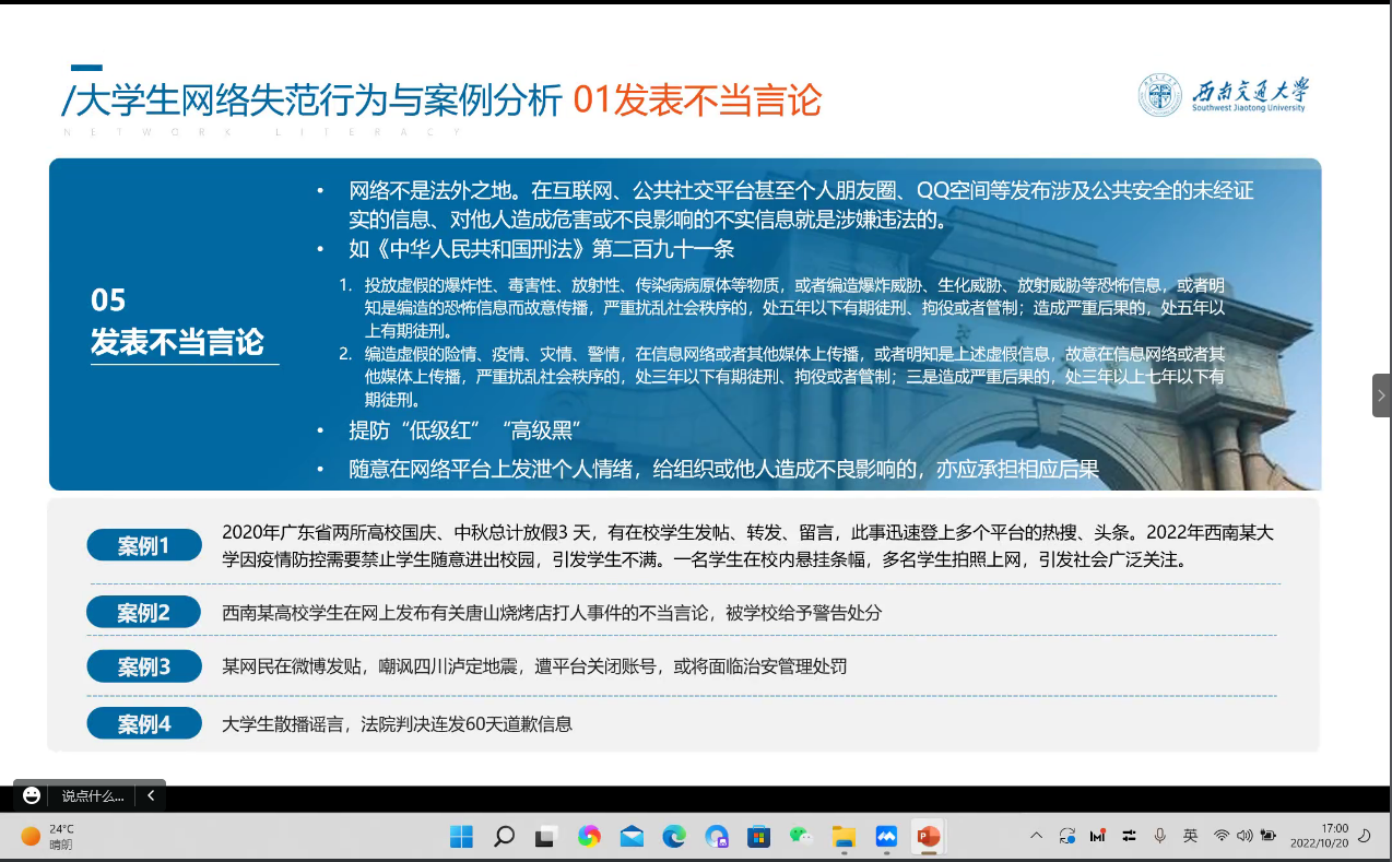 何鑫海列举了一系列大学生网络失范行为和案例,并进行分析以加深同学们对网络素养的理解。