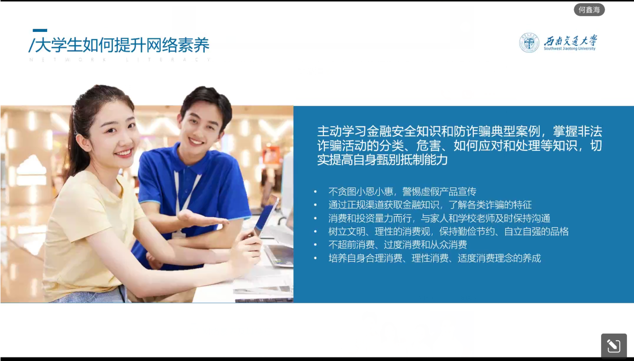 何鑫海向同学们讲述作为大学生如何提升网络素养。同学们需要主动学习法律法规,做到知法守法,坚决杜绝违法违规行为,积极投身实践,培养阳光心态,避免造成网络成瘾危害,主动参加丰富的劳动实践、班级活动、社团活动,从“键对键”回归到“面对面”。