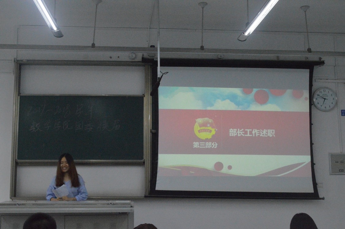 大会第三项,部长工作述职。各部门部长总结了所在部门这一学年的工作情况以及在活动中的收获,反思自己工作中的不足,表示将戒骄戒躁,更好地服务于学院以及广大同学。