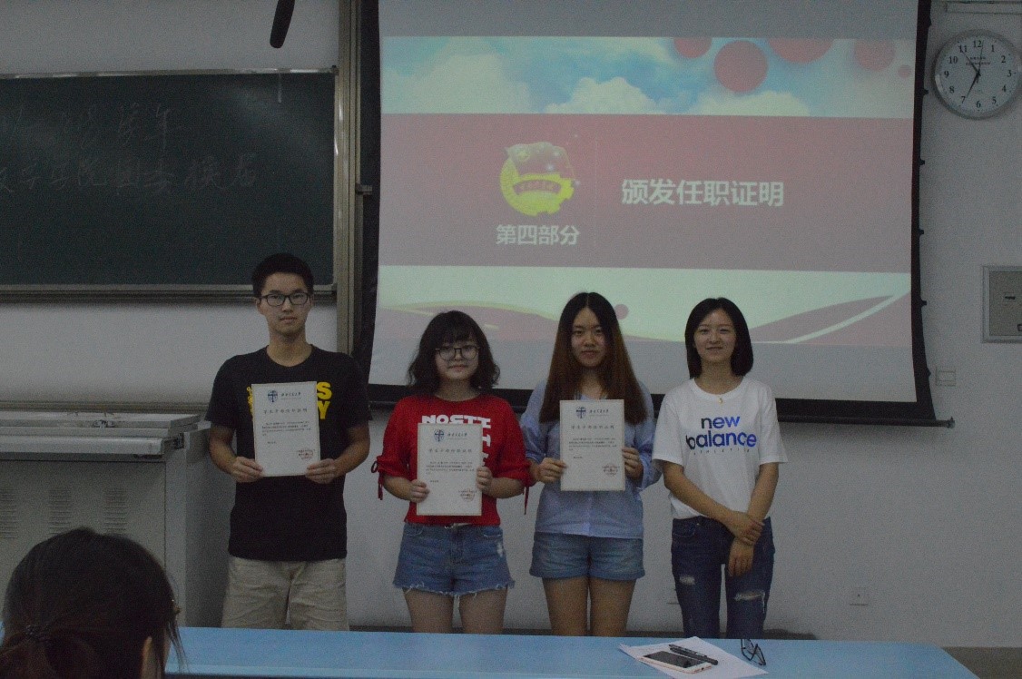 大会第四项,颁发任职证明。邓思然老师肯定了各部门部长这一年为团委做出的贡献,并为他们颁发了任职证明。