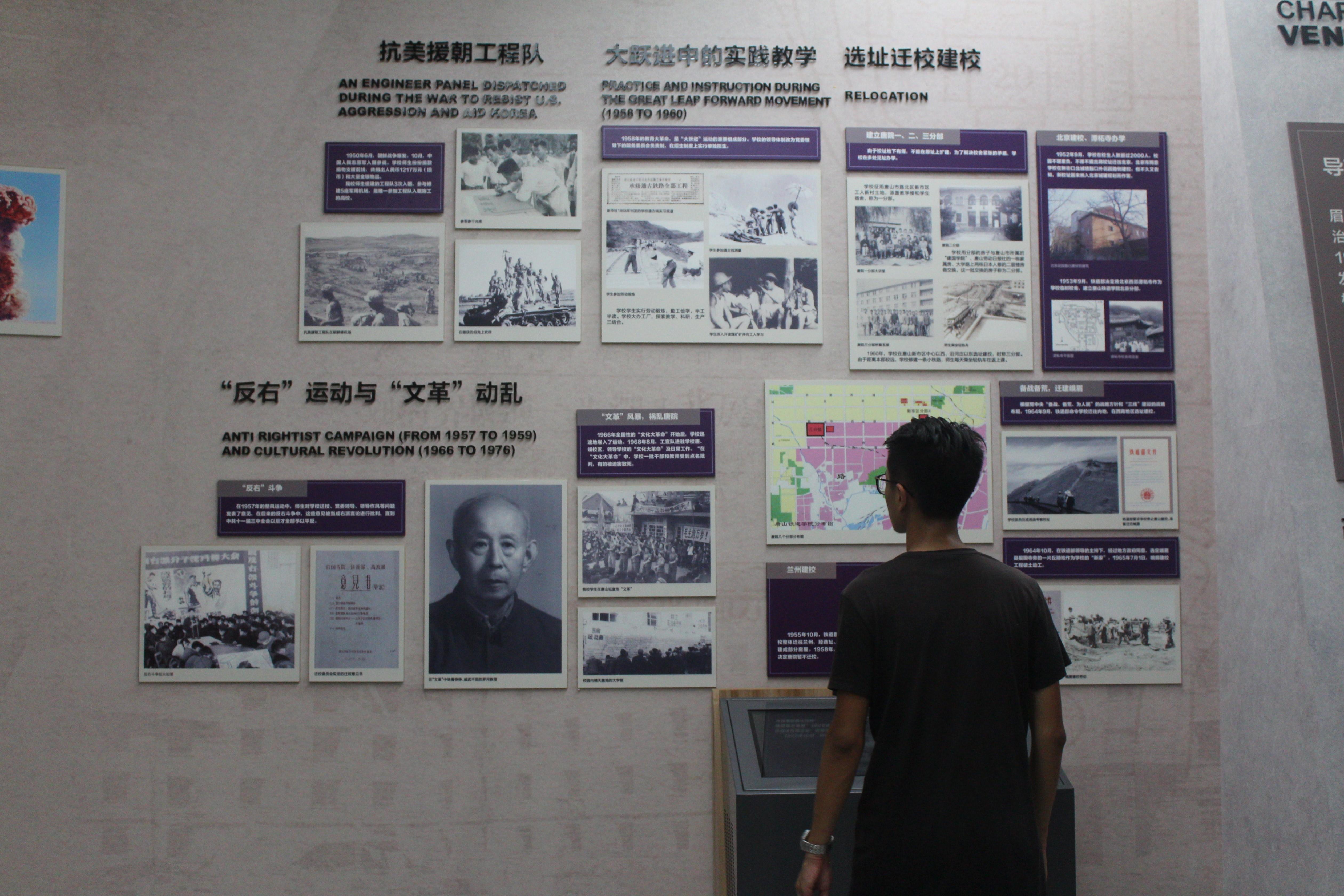 同学们从正门进入,由讲解员带领,从陈列着唐山老树根和校庆纪念碑的序厅开始参观。同学们沿着交大的时间线,从榆关始创,到复校唐山,再分别见到了交大的成就斐然、烽火薪传、迎接曙光、砥砺前行这些承载着百年历史长河中点滴瞬间的展厅,最后进入新世纪的展厅,创业峨眉、蓉城新篇以及交大力量展厅显示了交大依旧持续着的辉煌。