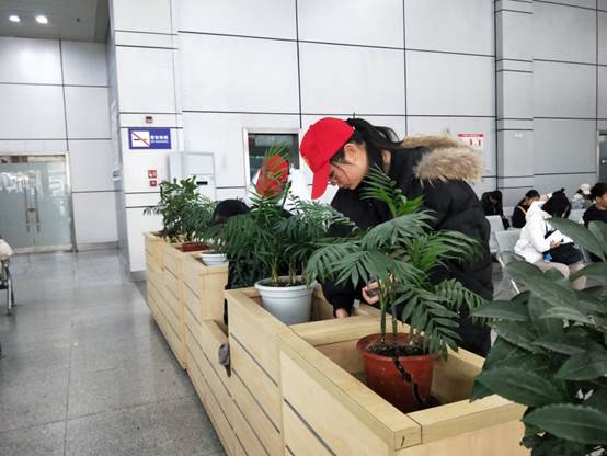 第二组打扫卫生的志愿者工作量比较大,但大家都很认真。有些同学带着手套,拿着抹布擦拭着候车大厅里的花盆,拿着钢丝球擦栏杆上的锈迹,努力地让大厅发出原来的色彩。一个下午的工作,每个人都全身心的投入到服务中,认真地打扫卫生。同学们一个个辛勤的背影折射出内心对志愿活动的无限热爱。