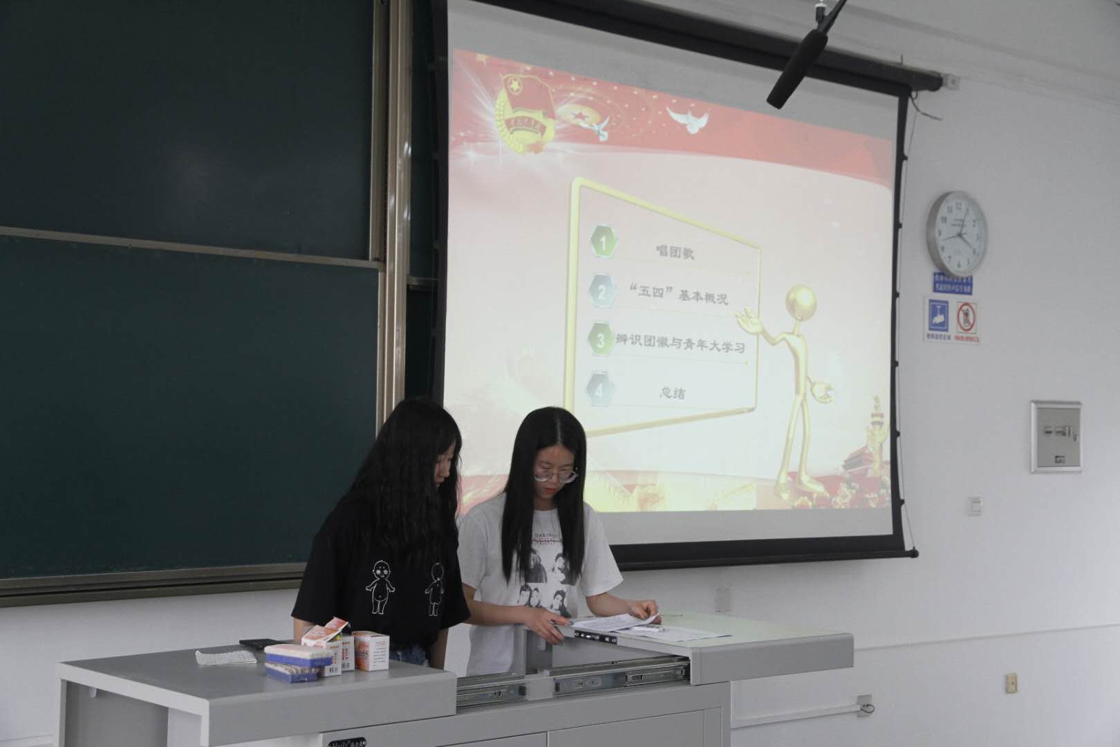 会议开始,全体团员齐唱团歌之后,邱灵同学为同学们讲解了五四运动的概况,重温历史,提出“弘扬五四精神,点燃青春之火”,各团员应该吃苦在前、享受在后,以身作则,展现团员作用,发扬团员精神。