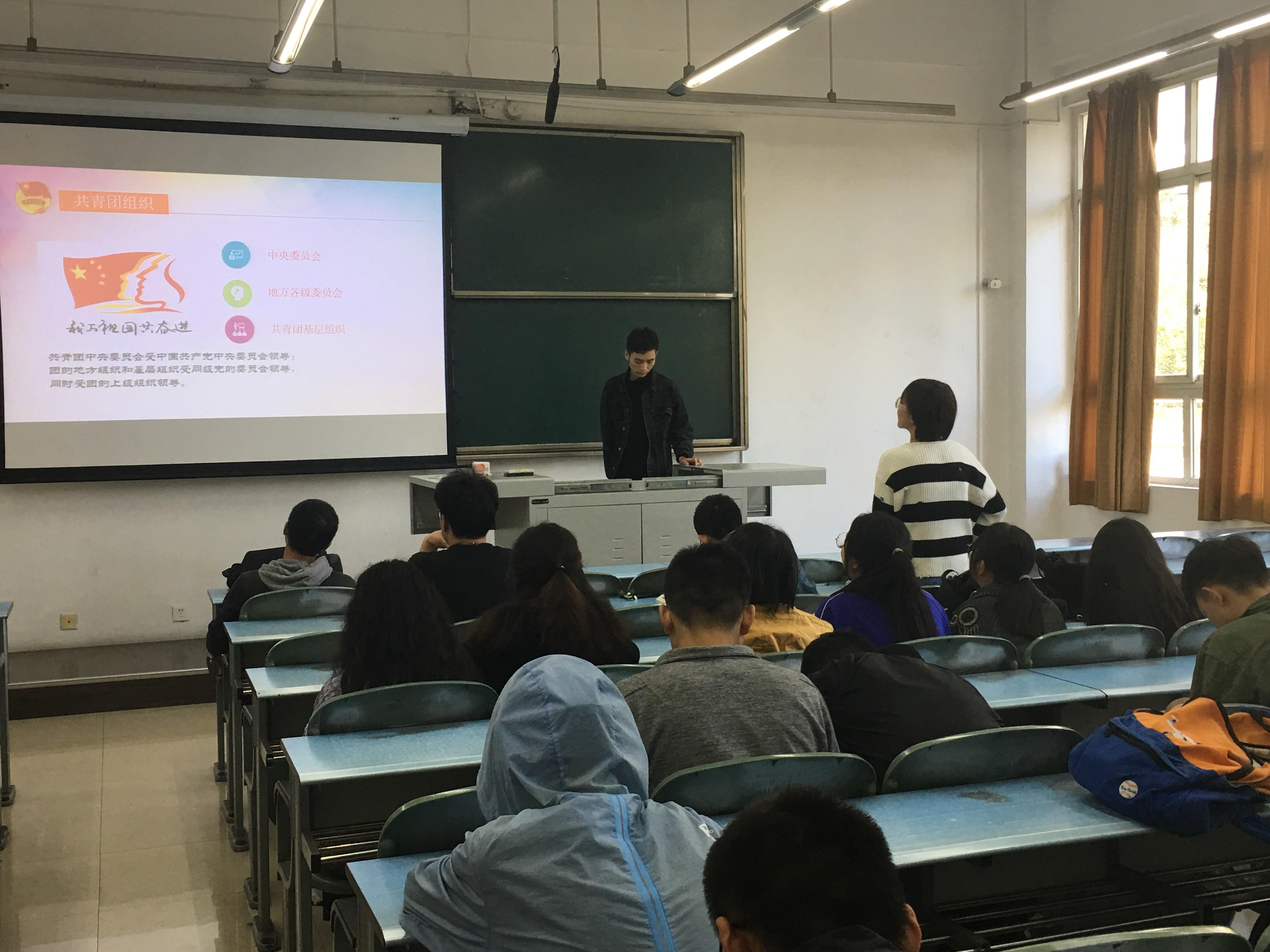 为了进一步加强团员的政治思想观念,增加团员对团组织的认识,增进团员对党的相关知识的了解,10月17日下午,18级统计二班团支部开展了开学第一堂团课的学习,由团支书李宏亮和副团支书蔡学峰负责主讲