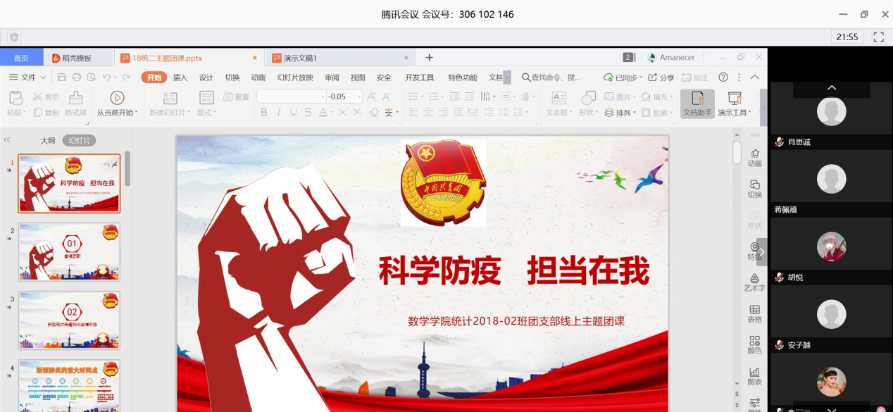 2020年的开年并不太平,新冠肺炎的横空降世极大地影响了中国人民的日常生活。战胜肺炎疫情是全体人民的切实心愿,也是我们共青团员肩上刻不容缓的责任。在这样的背景下,统计学2018级2班团支部以网课的形式,于3月5日开展“科学防疫,担当有我”主题线上团课。团支书李宏亮带领大家上了一堂意义深刻的团课。茄子视频