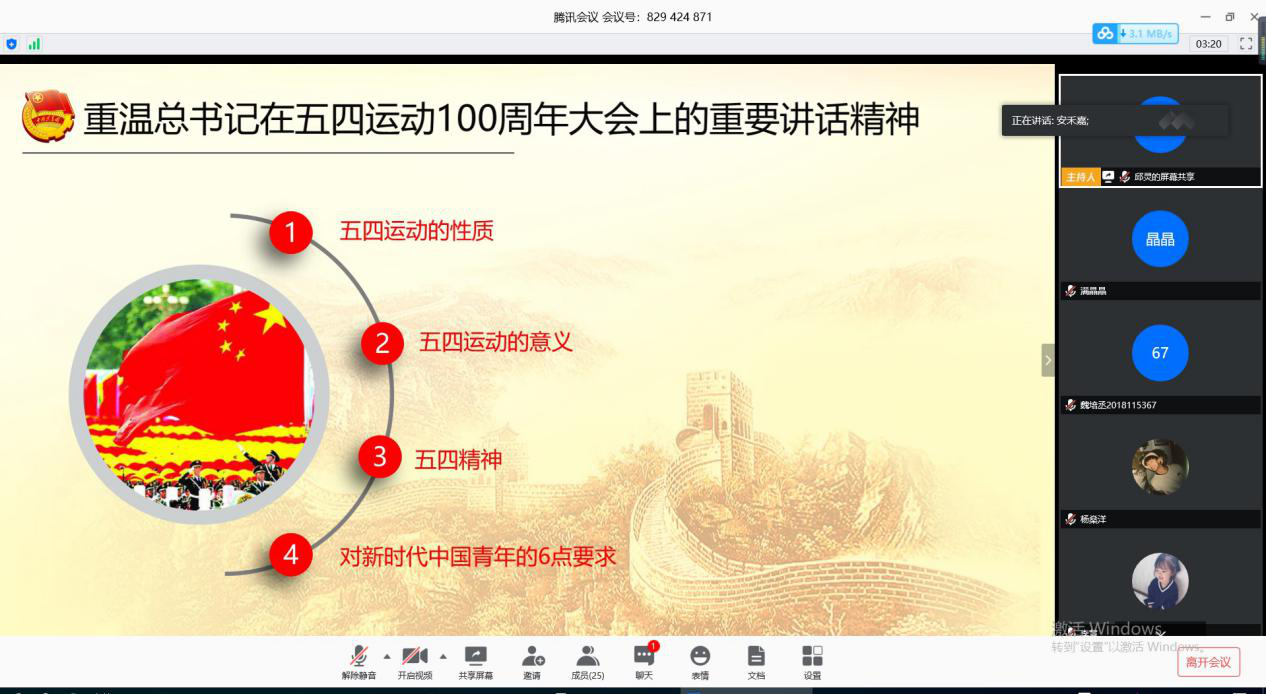 团日活动首个环节是由副团支书安禾嘉主持,重温习近平总书记在五四运动100周年大会上的重要讲话精神。他依次带领支部团员学习了总书记在讲话中谈到的五四运动的性质、五四运动的意义和五四精神的内涵。在最后,他重点讲述了总书记提出的对新时代中国青年的六点要求,深深激发了支部团员的担当意识。