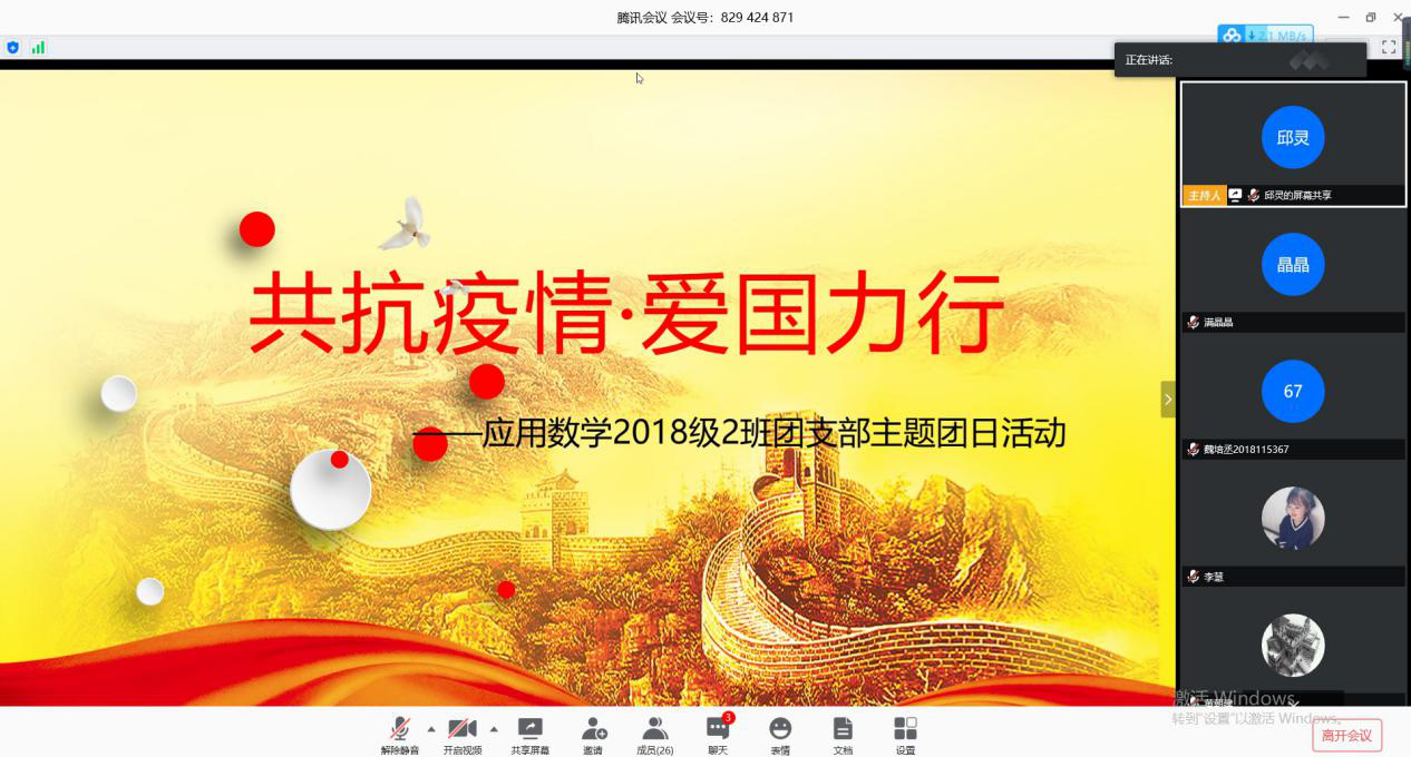 应用数学2018级2班团支部于2020年4月24日在线上开展了以“共抗疫情·爱国力行”为主题的团日活动,支部全体团员参与。团委“1+100”支部对接团干部林玉受邀参与活动。