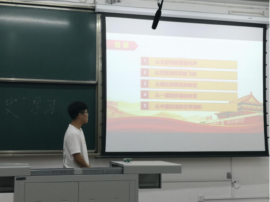 分别为党史、新中国史、改革开放史、社会主义发展史,由组织委员李雨桐、班长蔡学峰以及团支书李宏亮主讲。通过四史的学习,同学们对中国历史有了更深刻的理解。四史的学习,有着十分紧迫而深远的意义,它帮助我们身临其境地体会到我党走过的峥嵘岁月,感受革命奋斗从筚路蓝缕到渐入佳境。