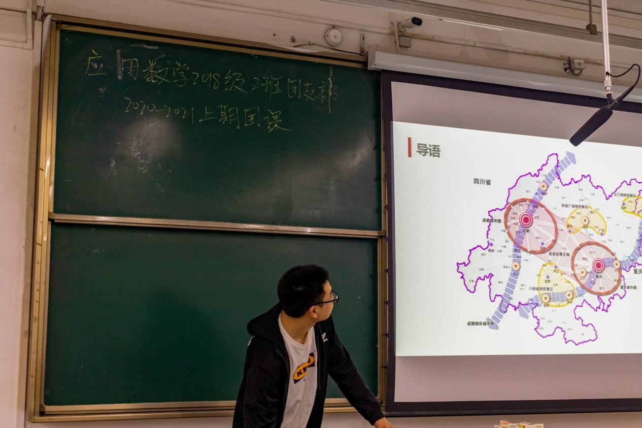为促进团员青年更加全面深入地了解“成渝地区双城经济圈”,感受时代变局中的青年机遇,应用数学2018级2班团支部于2020年10月24日下午15:30于X2532开展了2020年秋季学期“开学第一堂团课”。此次团课以“把握时代新机遇,唱好成渝双城记”为主题,由班长安禾嘉主持,数学二班所有团员全员到齐。特别地,邀请了团干部联系青年1+100对接人团委组织部部长林玉参加团课。