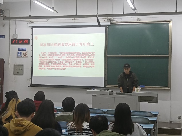 团日活动第一项议程,组织委员梁言组织大家学习习近平总书记在全国抗击疫情表彰大会上的重要讲话。