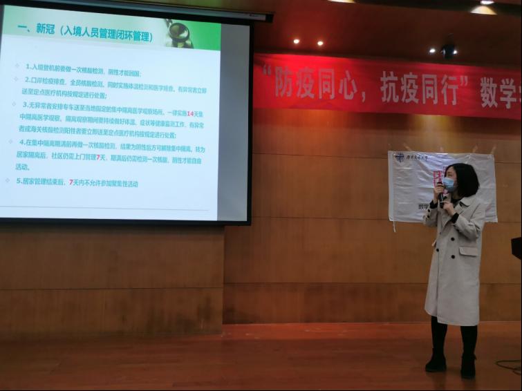 下午3时20分,讲座进行第三个环节,于芳芳老师为同学们讲解有关新型冠状肺炎和一些传染性疾病的知识和预防措施,如:新冠肺炎的当前形势、风险分析、趋势预测和临床表现等。接着,于芳芳老师又讲解了一些其他传染性疾病的基本知识和预防措施,包括流行性感冒,诺如病毒,水痘等等。讲解最后,于芳芳老师播放了一段防疫小视频,让同学们更加直观地学习如何防范疫情。