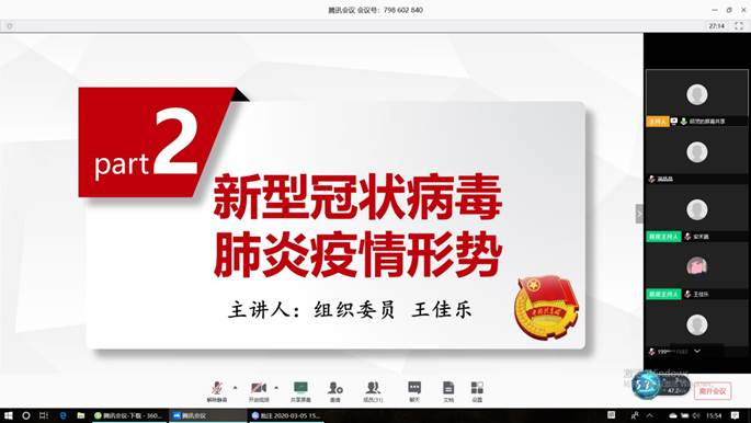 接着,组织委员王佳乐介绍了新型冠状病毒肺炎疫情的发展以及最新的情况。她谈到,此次疫情正值春节期间,形势紧迫。全国各族人民在党的坚强领导下,众志成城,支援武汉,疫情防控工作有效进行。据统计,截至2月25日凌晨四时,全国共26个省市新增病例为零,治愈患者超千人。
