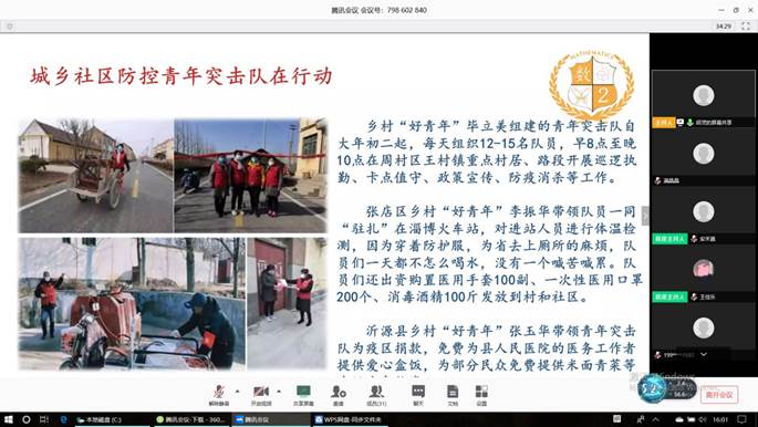 随后,邱灵就疫情阻击战中共青团员的担当进行了讲解。她指出,在党的坚强领导下,全国人民正在进行防控新型冠状病毒的人民战争。团员青年们在没有硝烟的战场后方实打实地进行服务,在城乡社区的引导下,发挥着在城乡基层治理体系中的独特作用,展现出党的助手和团员后备军的担当和作为,为坚决打赢疫情防控人民战争贡献青春力量。面对疫情严峻的形势,青年突击队应运而生,他们主动请缨,在铁路、公路、航空、水运、城市地铁等城市交通领域作出重大贡献,返乡大学生、团员们积极响应号召,用脚步、用技能、用担当,在自己的专业领域贡献自己的力量。