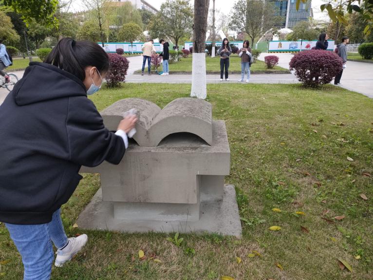 分组一的同学擦拭了石碑,同时也把草坪上的一些杂物给扫除。
