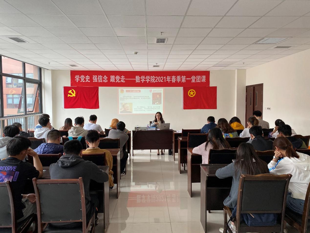 团委书记邓思然老师讲授团课。统计学2019级01班全体同学参加团课。