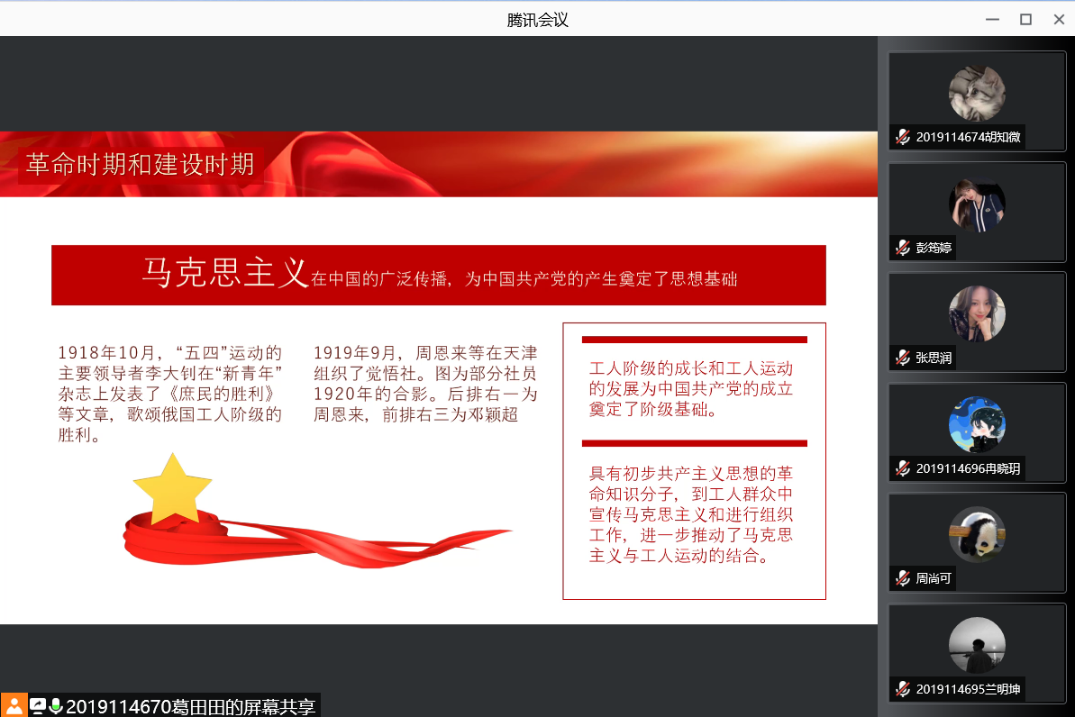 在10月22日晚七点,19级统计一班召开了主题为“热烈庆祝中国共产党成立100周年”的秋季开学第一堂团课。会上,团支书与同学们共同回顾了中国共产党走过的百年历程,了解了当前我们党的历史任务,并结合青年人在国家社会发展中的重要作用,展望了未来的国家发展前景。