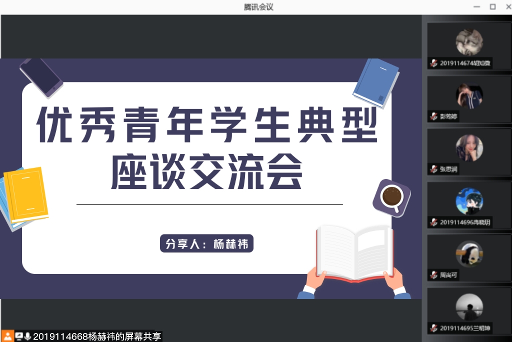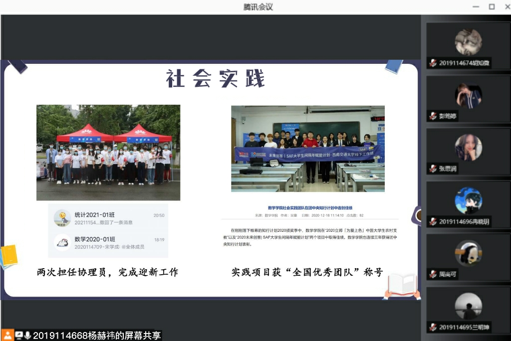 12月5日下午15:00,统计学2019级1班团支部“优秀青年学生典型座谈交流会”于腾讯会议线上召开。本次经验交流分享由2020——2021年度“竢实扬华奖章”获得者,统计2019-01班的杨赫祎同学主持。他向同学们分享了他在两年多的大学学习生活中的经验体会。