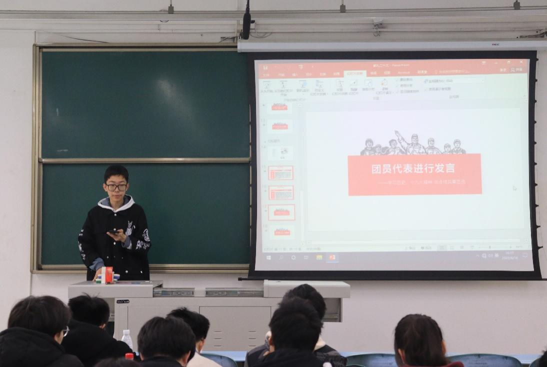 团课第二项议程,团支书莫楚滨带领同学们回顾中国共青团的光辉历程。