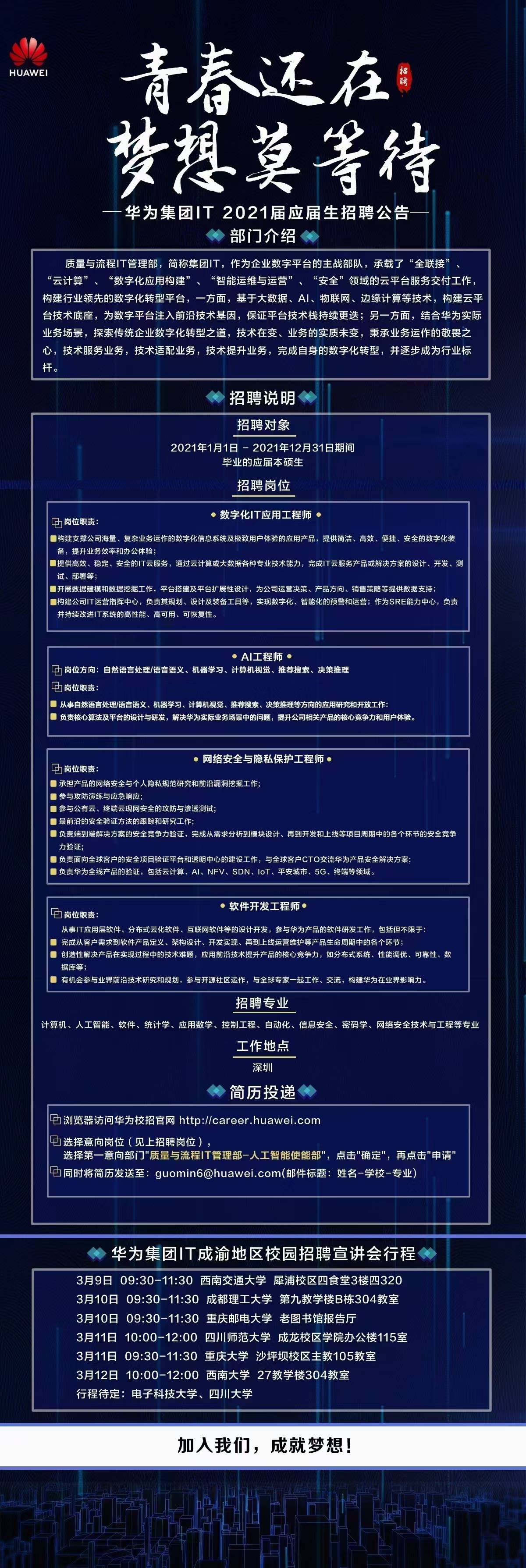 华为集团IT应届毕业生茄子视频 专场招聘会,时间:2021年3月9日晚上7:00,地点:四食堂三楼317会议室