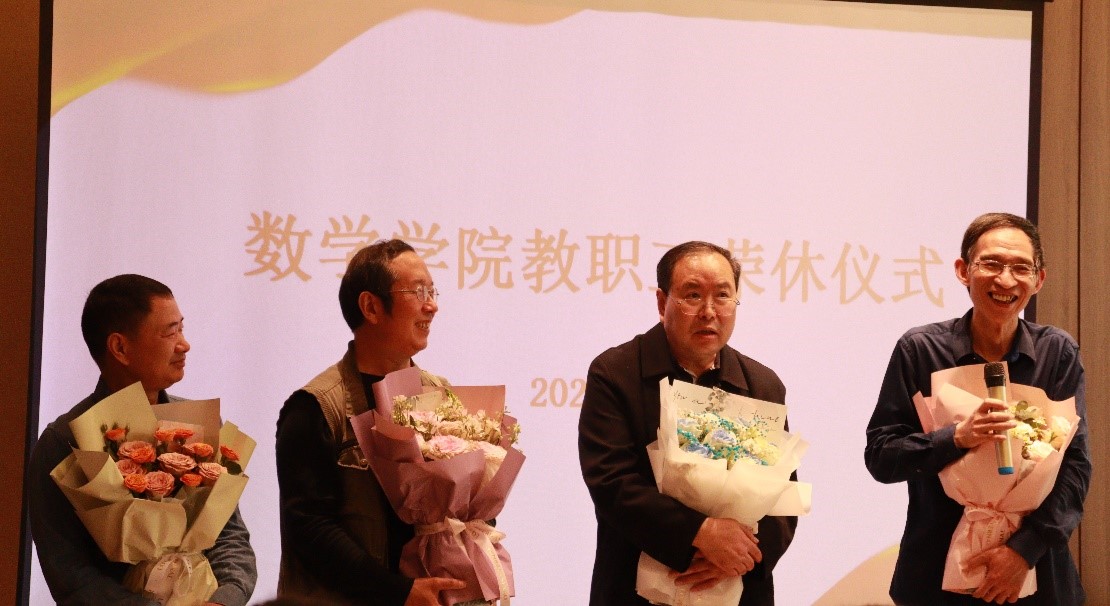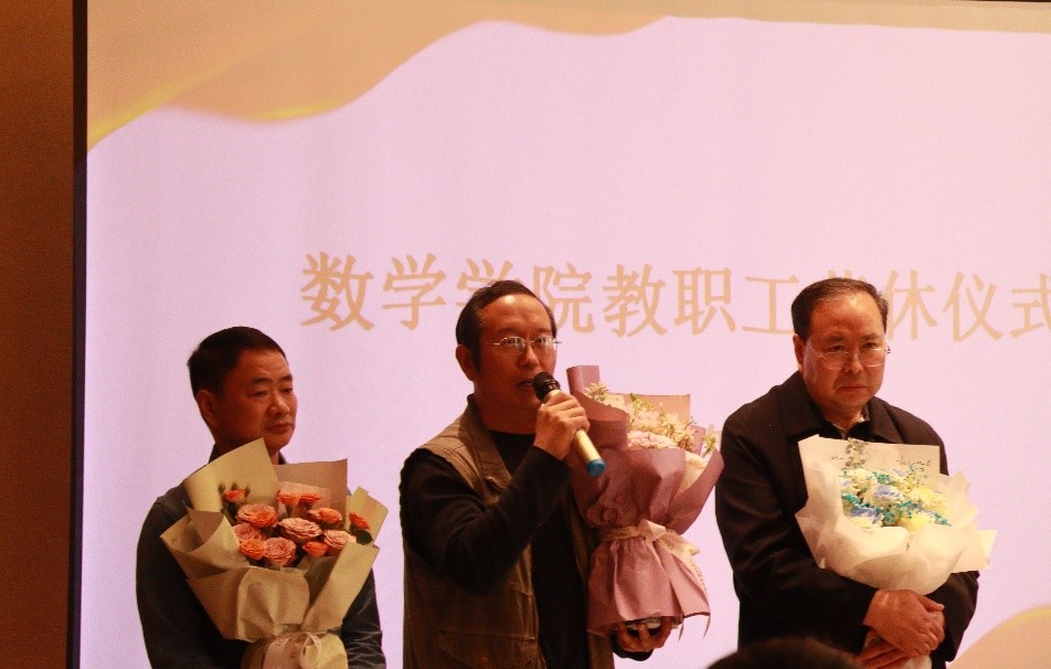 荣休教师徐扬教授讲话。徐扬教授回忆了学校数学学科建设发展历史。他表示,正是历届教师的不懈努力,才有了学院各专业的发展,才有了如今学院的进步与成就,希望老师们继往开来,开拓进取。同时他表示,由于学院秉持先进的教育理念,重视人才引育,解决了本校数学师资缺乏的问题,希望学院继续重视人才引育。最后,他对学院实验室平台提出期望,希望全院老师继续努力,对国家、学校和学院发展做出更多更大的贡献。