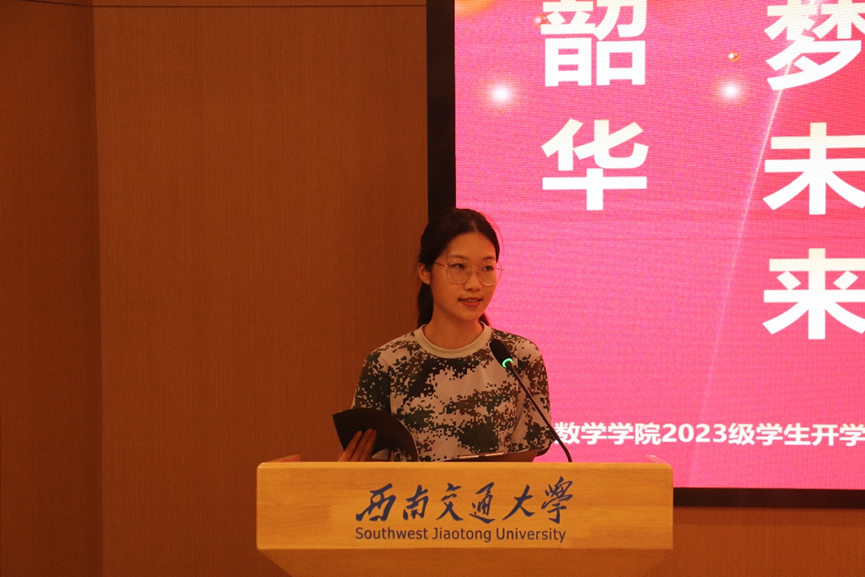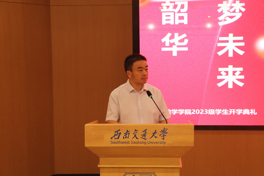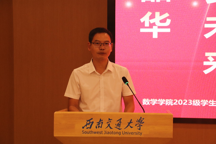 院长杨晗教授致辞,他对2023级277名本、硕、博的到来表示热烈欢迎。杨院长向全体新生介绍了交大的历史和学院的基本情况,他指出,一代代数学人为学校“竢实扬华,自强不息”的精神和“严谨治学,严格要求”的传统做出了巨大贡献。杨院长向新生们提出了三点期望:一是胸怀祖国、担当使命;二是树立目标、行稳致远;三是脚踏实地、勤学奋进。杨院长鼓励同学们珍惜韶华、把握机遇、勤学苦练、锐意进取,在茄子视频