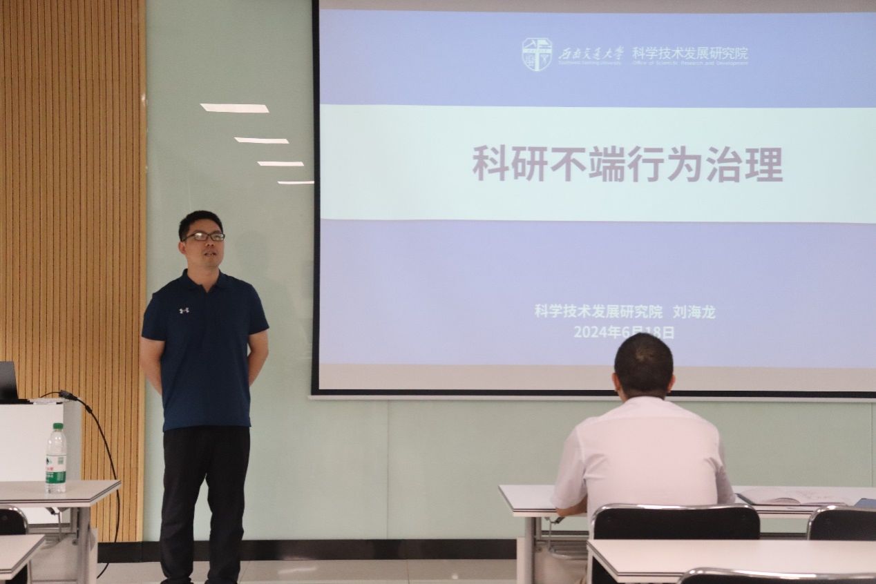 会议第二项,来自科学技术发展研究院的刘海龙老师为导师宣讲“政策直通车”。他概述了在新时期科研诚信的背景下科研不端行为,同时列举相关案例,讲述了科研不端行为的严重危害及处理措施。刘老师表示希望导师们胸怀科学家精神、端正科研态度,争做新时代研究生导师。