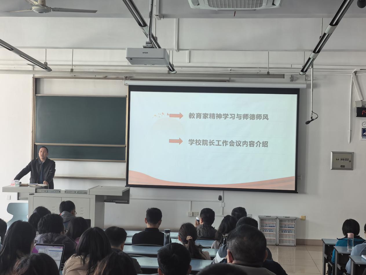 首先,杨晗院长对全院教职工进行教育家精神学习辅导和师德师风警示教育。杨晗院长指出,培养什么人、怎样培养人、为谁培养人这是教育的根本问题,关乎党和人民事业发展的根本,杨晗院长希望全院教师深刻领悟思考,牢记“心有大我、至诚报国的理想信念,言为士则、行为世范的道德情操,启智润心、因材施教的育人智慧,勤学笃行、求是创新的躬耕态度,乐教爱生、甘于奉献的仁爱之心,胸怀天下、以文化人的弘道追求”的教育家精神,结合自身工作,以实际行动,贯彻落实立德树人根本任务。