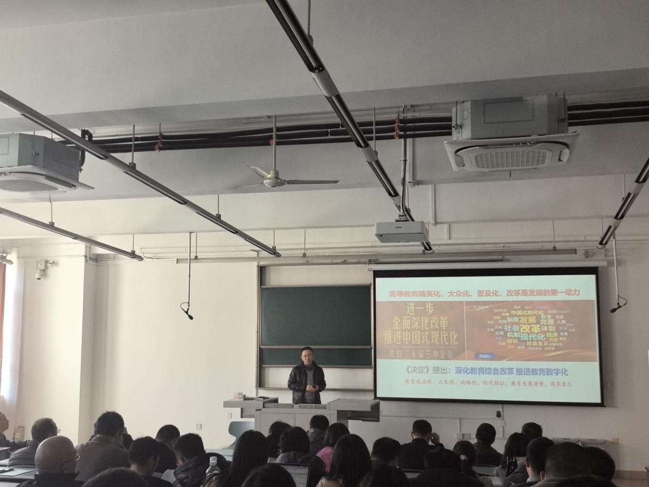 潘小东副院长结合学院教育教学工作,带领全院教职工,进一步学习党的二十届三中全会精神。全会通过的《决定》对深化教育综合改革作出系统部署,全院教师要加强对教育综合改革的理解,积极探索创新,为推动学院和学校事业高质量发展贡献力量。