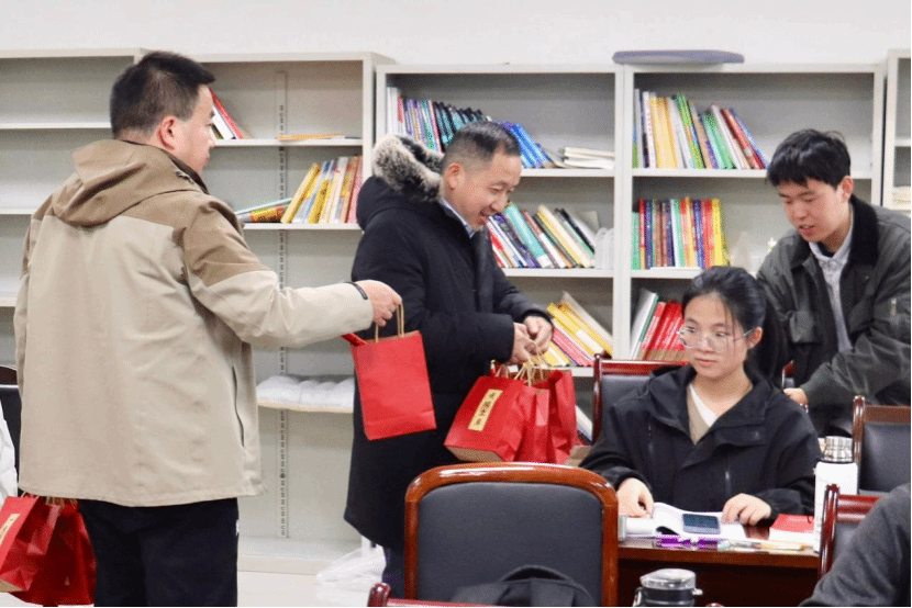 随后,杨晗院长,黄祥副书记,潘小东副院长向大家分发了精心准备的慰问礼包,同学们深受感动与激励,他们也将满载着学院的祝福与期许,以更坚定的信念和更饱满的热情去迎接考研的挑战。