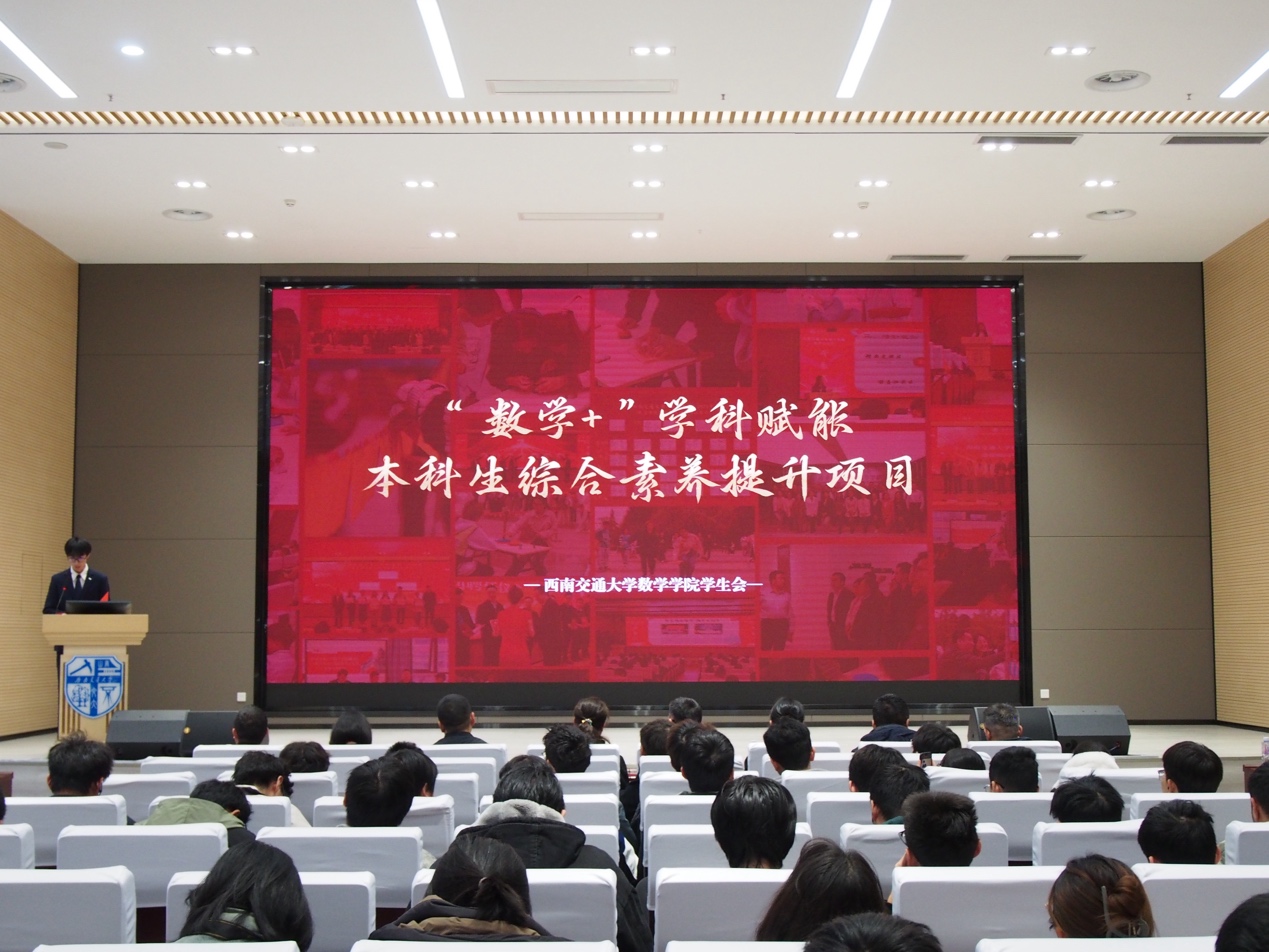 学生会主席团成员王旭东向师生推介了“数学+”学科赋能本科生综合素养提升项目。此项目重点从数学学科强基、理工科交叉融合、数学文化节品牌活动、川内高校交流合作四个维度,构建了“数学强基、交叉融合、文化浸润、交通天下”的格局,用心用情开展让交大学子受益的精品项目,为数学强基贡献交大数学人的担当。