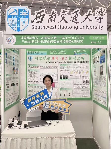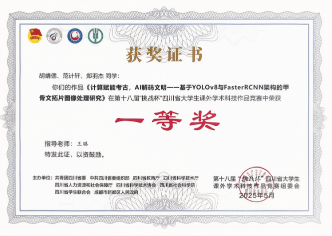王璐教授指导,计算机与人工智能学院本科生胡靖偲、物理科学与技术学院本科生郑羽杰和范计轩组成团队的作品《计算赋能考古,AI 解码文明——基于YOLOv8与Faster R-CNN架构的甲骨文图像处理研究》在自然科学类学术论文赛道表现出色,荣获四川省一等奖,实现了茄子视频