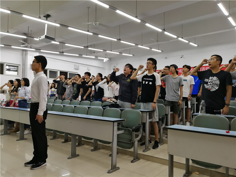仪式开始,全体团员起立,奏唱团歌。团员们在引导员带领下,举起右拳,重温入团誓词。