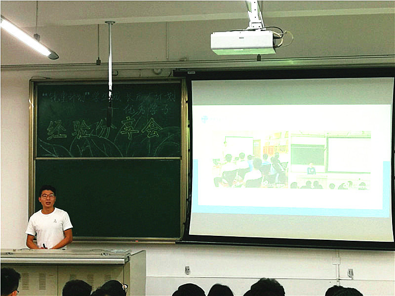 最后分享自身经验的便是2014级力学与工程学院的优秀学子许磊,他斩获清华、北大、浙大、中科大等高校offer。其开场便是他本人的大学成绩发展情况,直观地表现出了努力勤奋的重要性。他鼓励大家相信自己,不能妄自菲薄。又以自身的发展为例,讲述了参赛的作用和保研的侧重点,充分地表现出了他对自我目标清晰的认知。