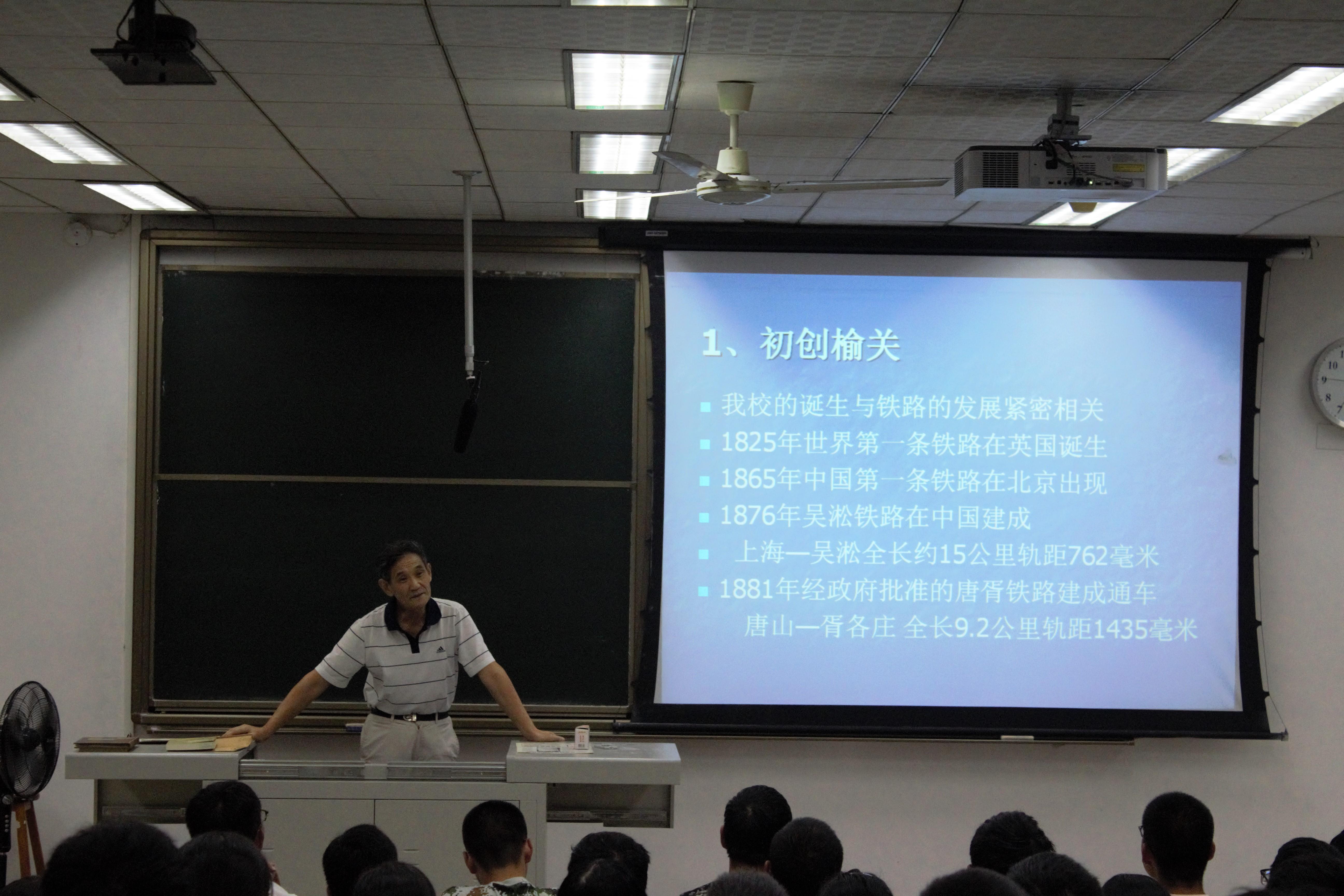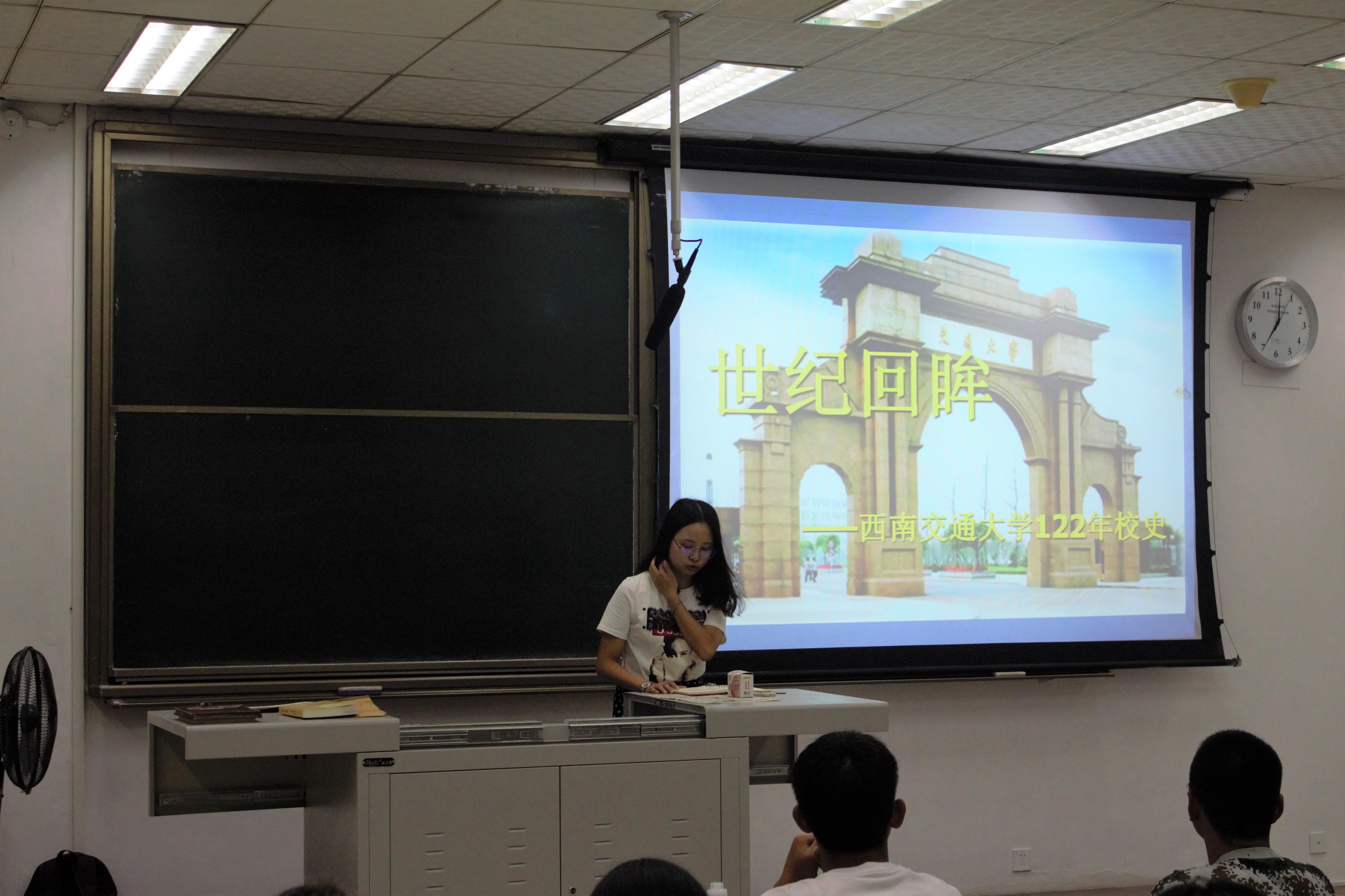 的诞生及发展历程、优良的校风及光荣传统和百年铸造的精魂。他以时间为顺序,通过初创榆关,复校唐山,搬迁峨眉,定址蓉城和扩建犀浦五个关键时间点,向新生们详细解说了交大122年的辉煌校史。