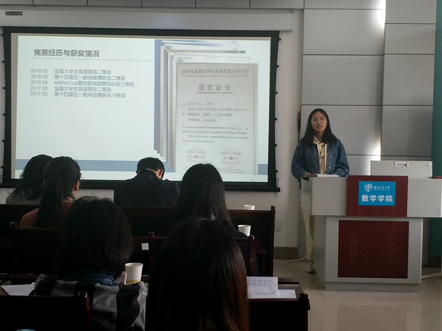 接下来轮到研究生做出答辩。这一环节,首先是研究生标兵答辩,由答辩人王慧霞、高琪、曹宇宇三人展示研究生的个人风采。他们从科学竞赛、社会实践、学习成绩等若干个方向阐述自己身为研究生的杰出方面,展现出他们的个人精神风貌以及优秀的个人综合能力