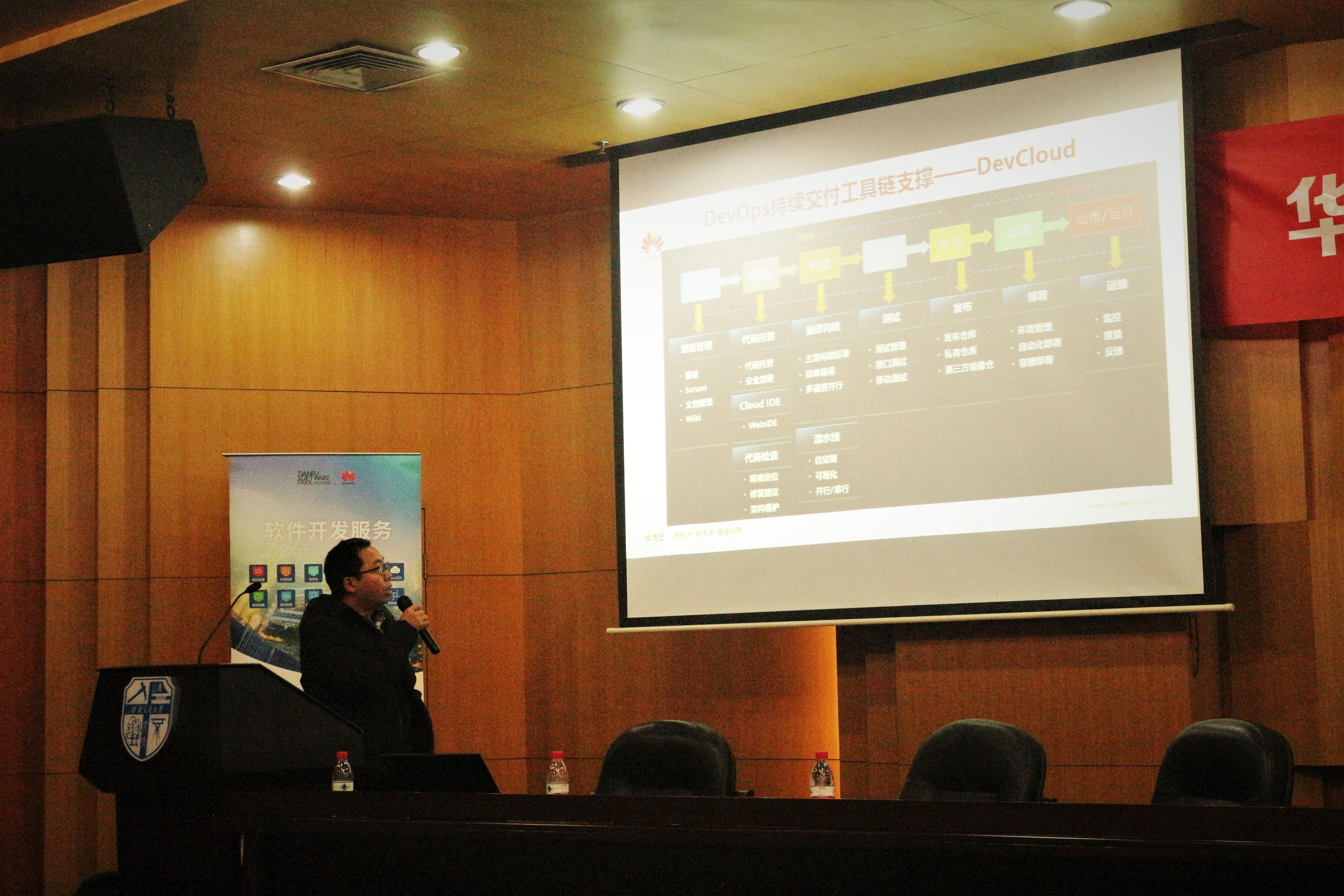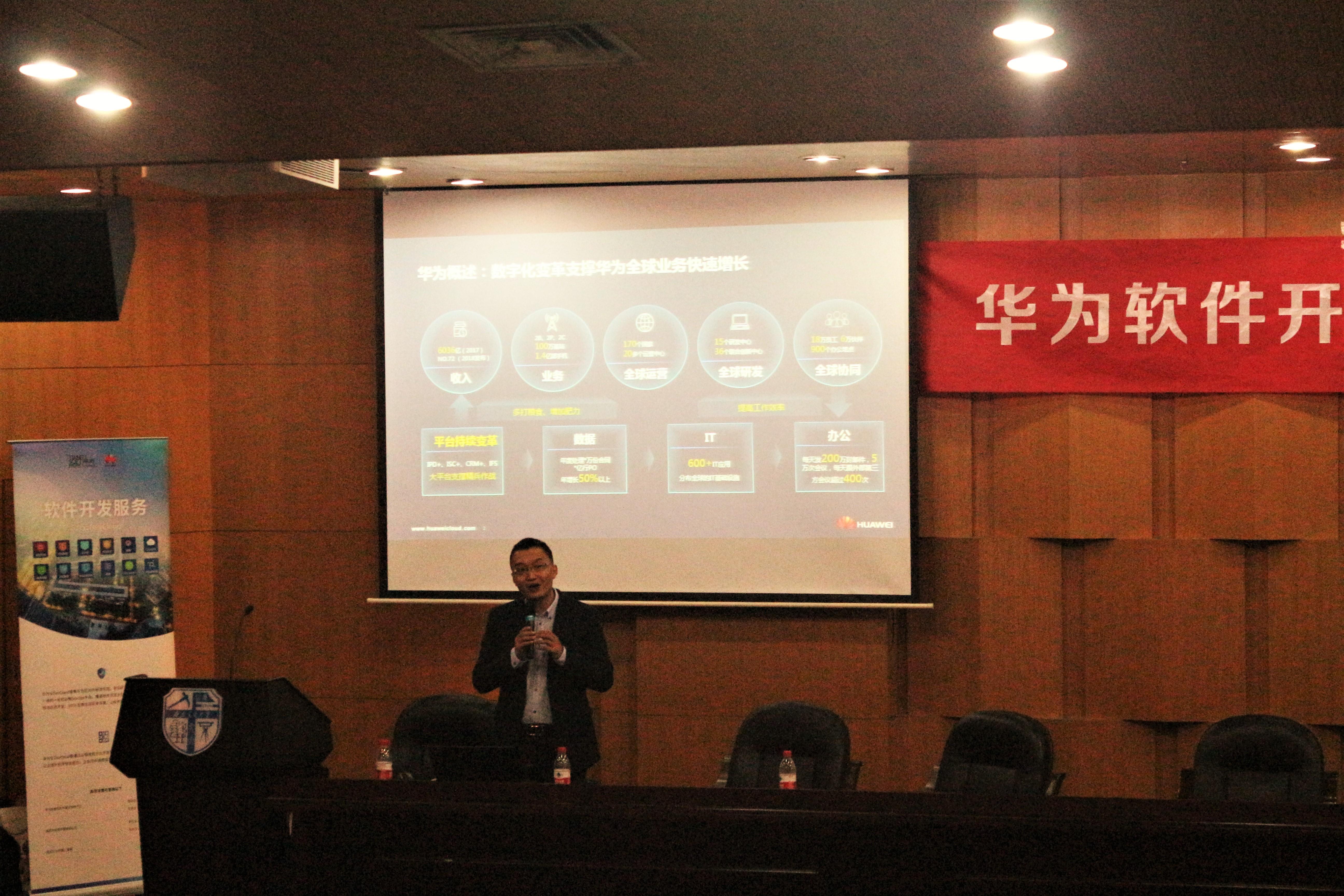 于12月17日晚上7:30在图书馆二号报告厅与华为公司合作举行了“华为软件开发云开课仪式”。本次活动由华为公司主持,交通运输与物流学院谢军老师、华为云解决方案总监游强、华为软件开发云解决方案专家严国龙、华为公司员工以及部分交大学生参与。