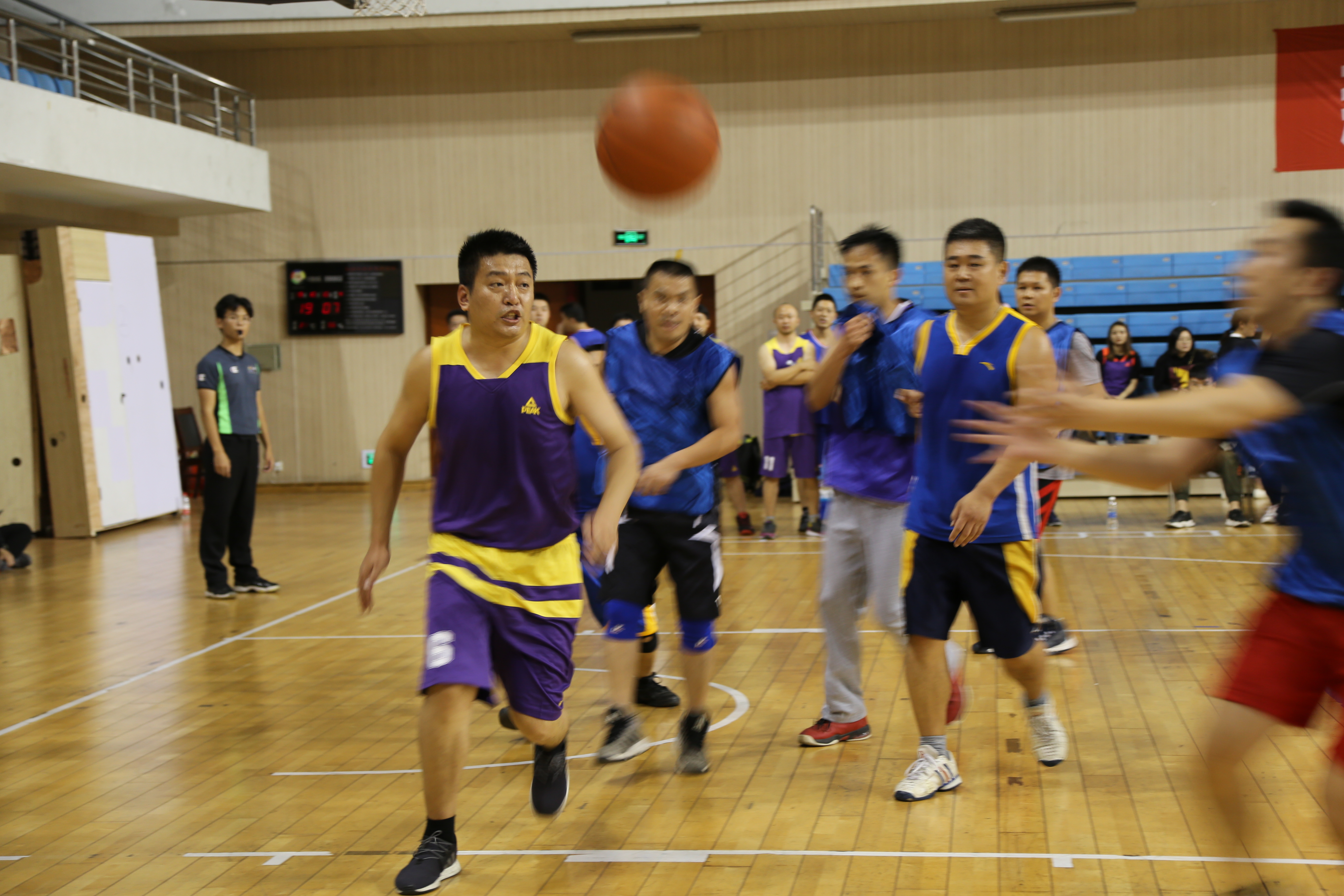 的老师们不断突破篮下得分,把握罚篮机会紧咬比分,一度追分到一分之差。焦灼的比分也吸引许多其他学院的老师前来观战、加油鼓劲。