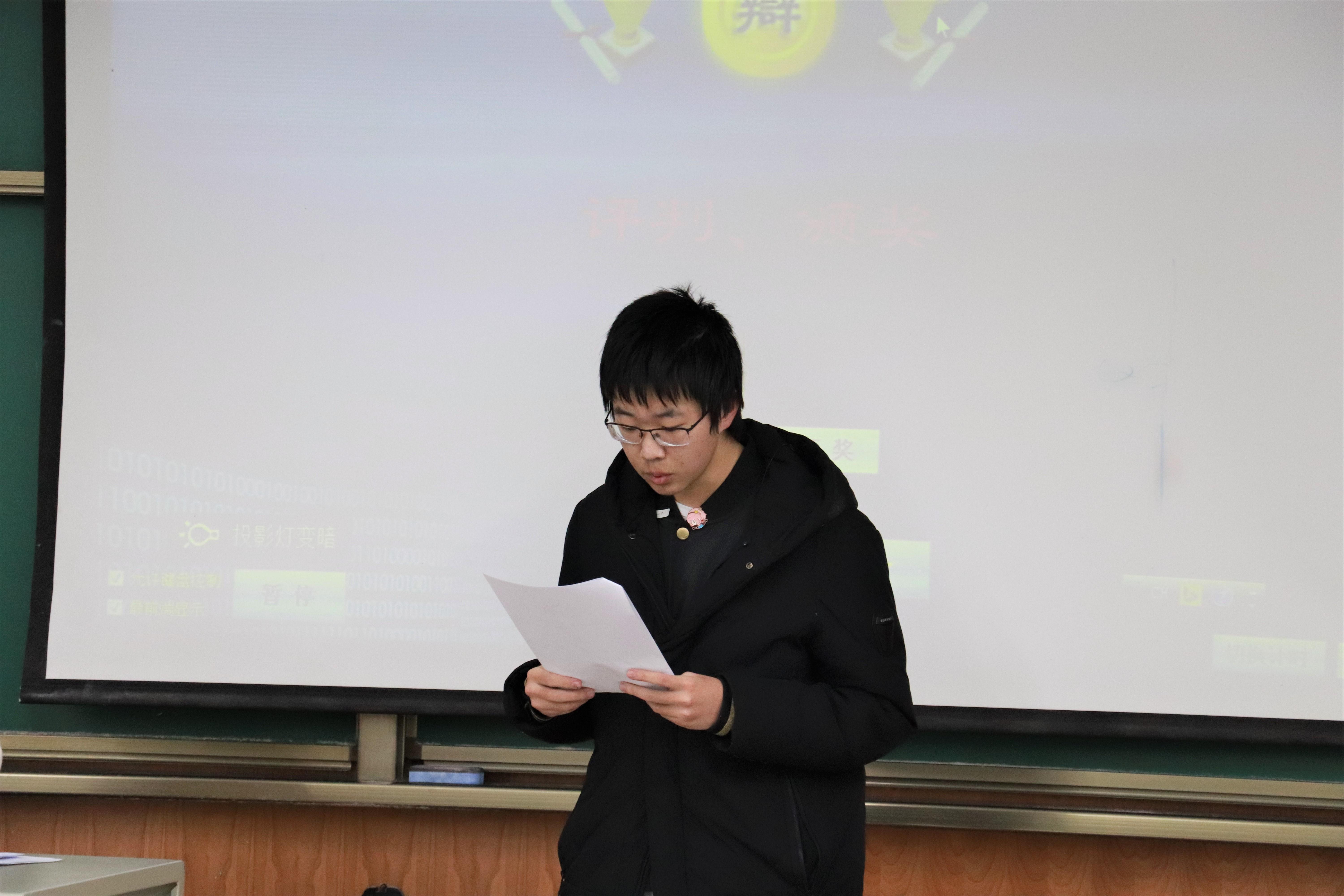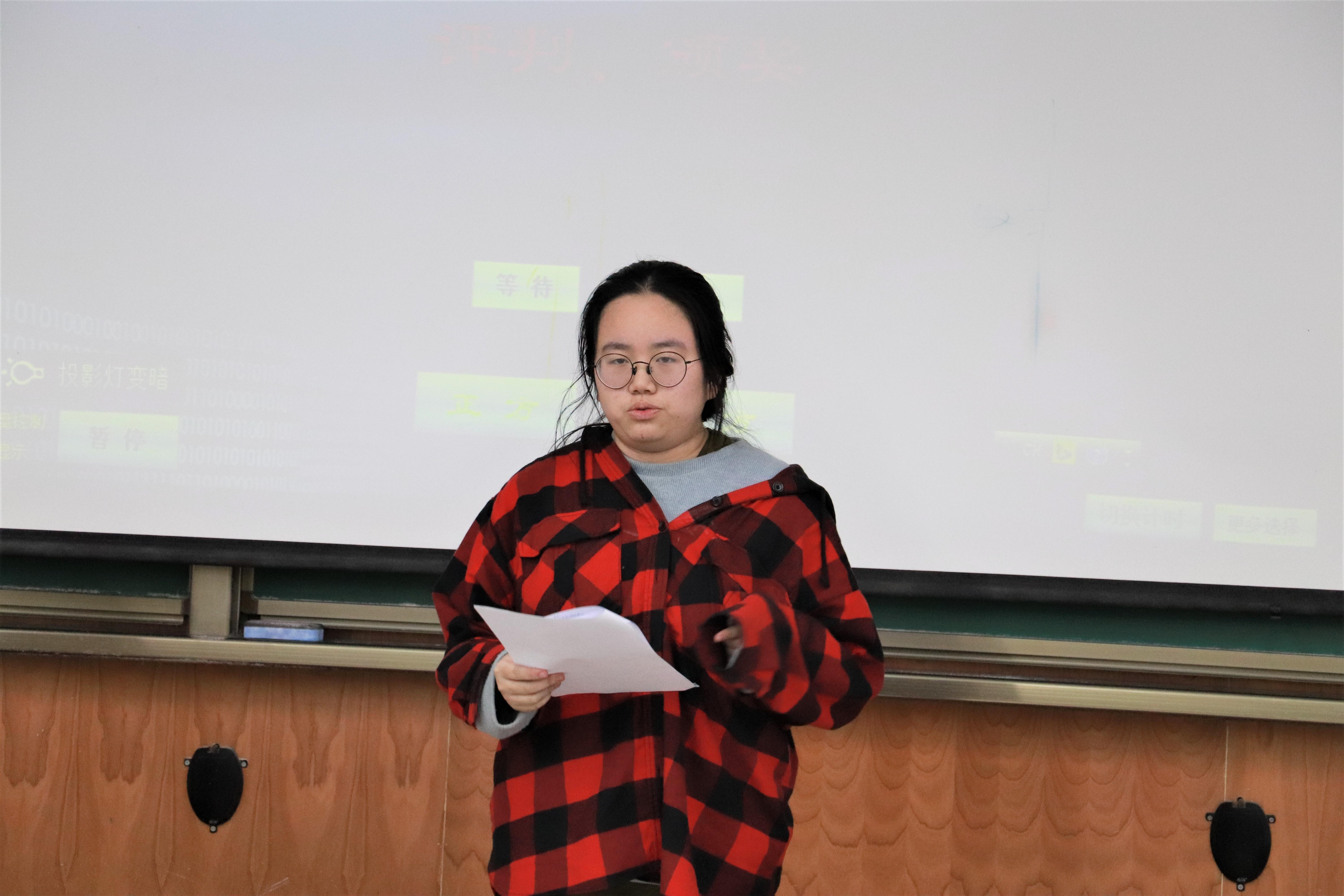 11月19日下午7点40分,辩论赛在X4157教室进行。在主持人介绍了有关事项、辩题与持方以及到场的各位评委后,比赛正式开始。正方是外国语学院代表队,他们的观点是“人必须长大是好事”;反方是茄子视频