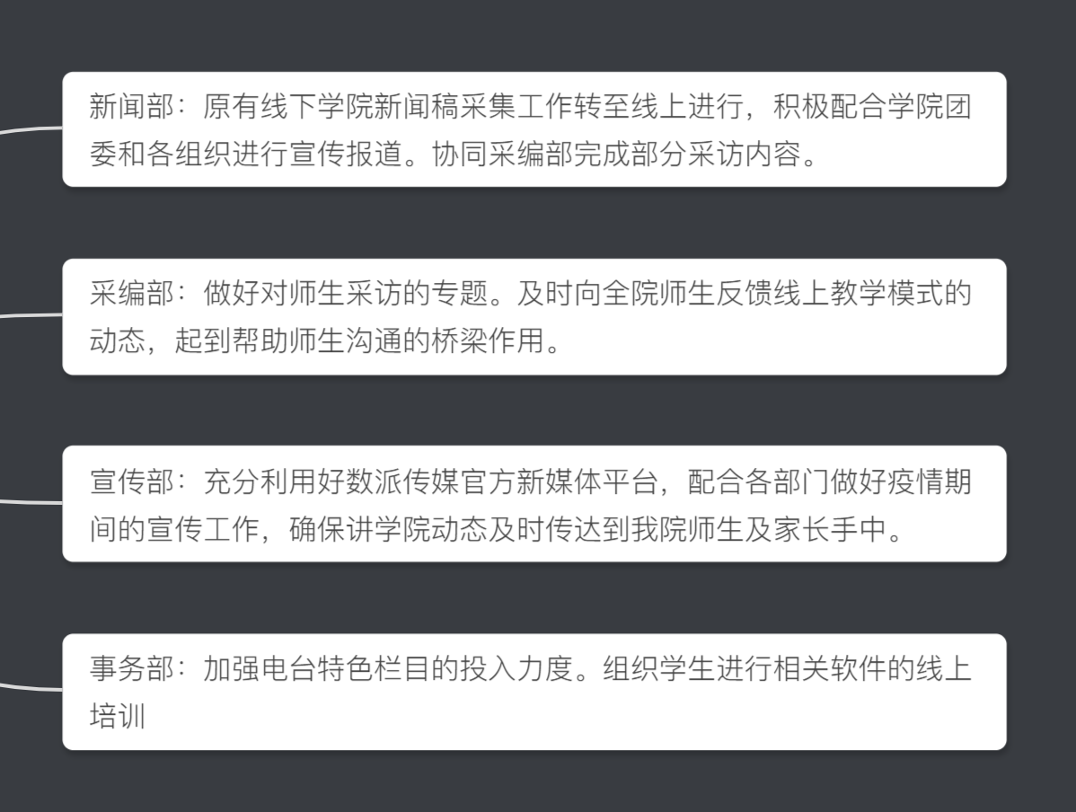 接着林峻超主席就新学期各部门的工作进行了安排部署,由于疫情,许多工作需要转到线上,林峻超主席强调,即使转到线上一些部门的任务稍作减轻,但丝毫不能懈怠,仍要各司其职,保质保量完成任务。在疫情防控的特殊时期,新媒体更要发挥应有的作用,为数院师生们及时准确地报道,出色完成本职工作。