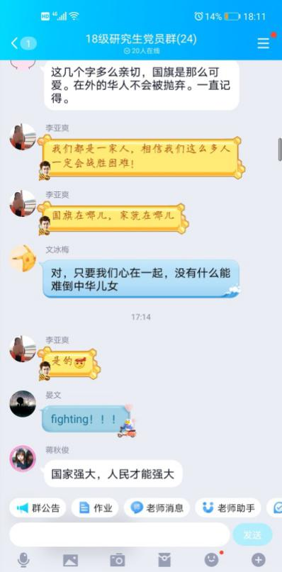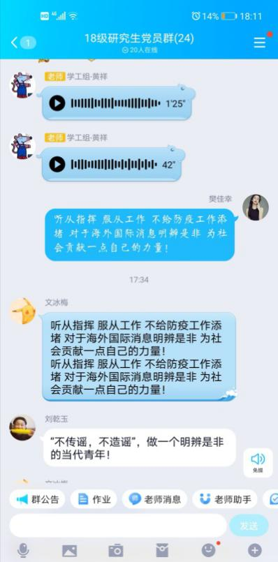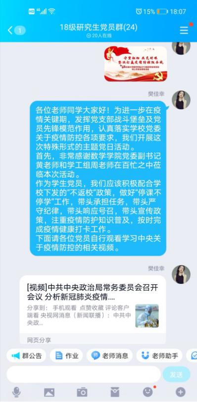 2018级研究生党支部召开疫情防控线上主题党日活动。本次活动以“守望相助,共克时艰,坚决打赢疫情防控阻击战”为主题,依托QQ群聊平台开展,茄子视频
