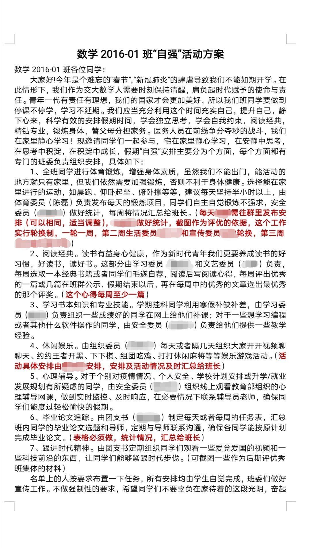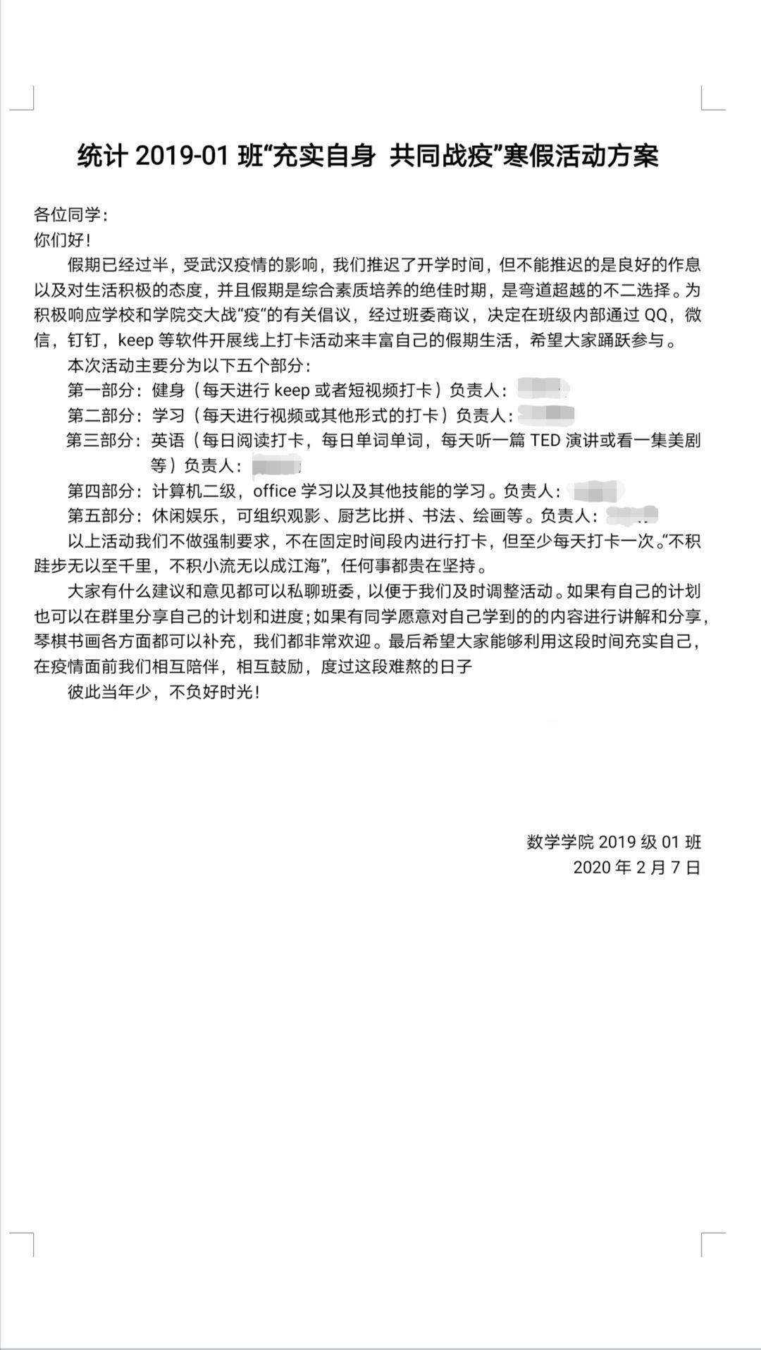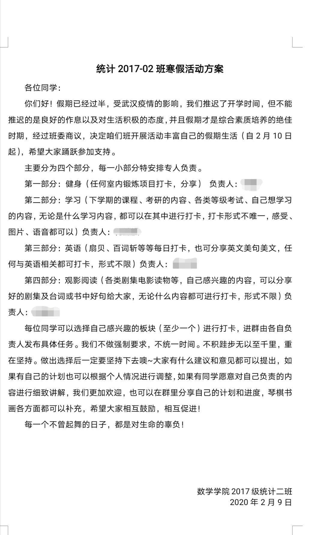 倡议书发布后,各班班委积极响应学院号召,制定了符合班情的个性化方案,要求同学们在社交软件上每日打卡,同时也安排了各项活动的负责人进行组织与监督。同学们也纷纷以班级为单位,在疫情面前相互鼓励,相互陪伴,共同提升。