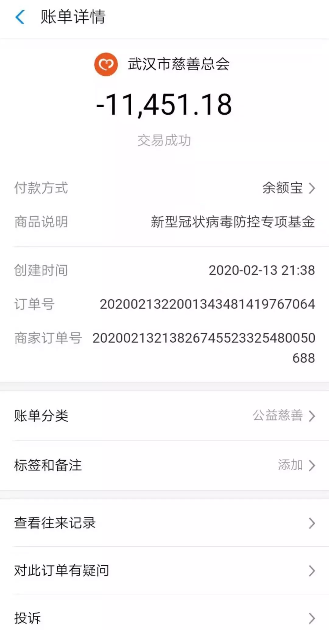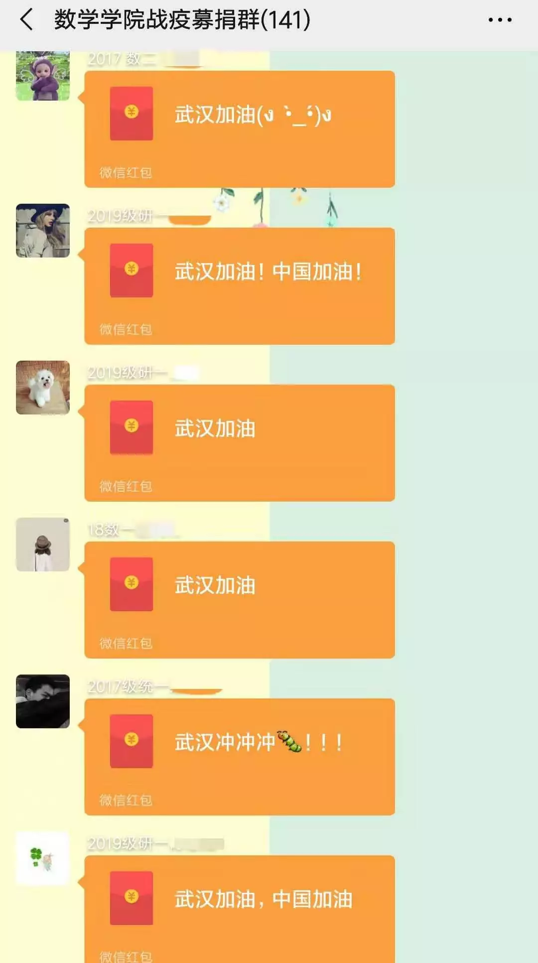 战疫募捐群,并在群内进行实名捐款。截至2月13日上午11时,学院共收到141位师生的捐款,共计11451.18元。筹集到的资金直接转账给武汉市慈善总会,并由负责人在群内实时公示捐款进度与捐款详情。